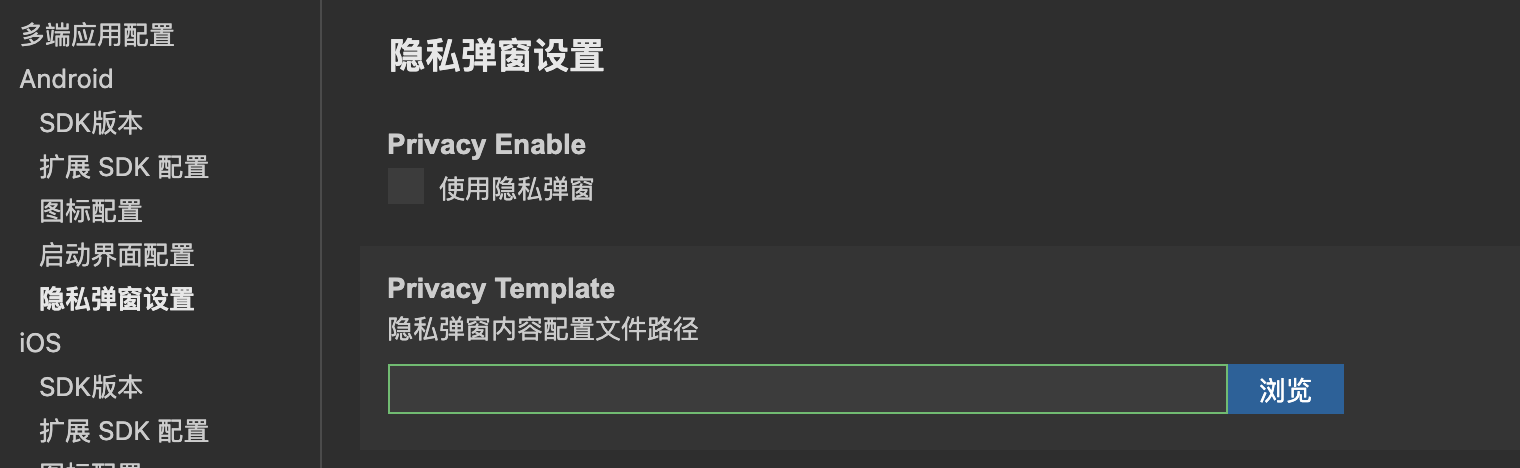 - Privacy Template:选择弹窗内容配置文件。(文件格式参考 3.2)