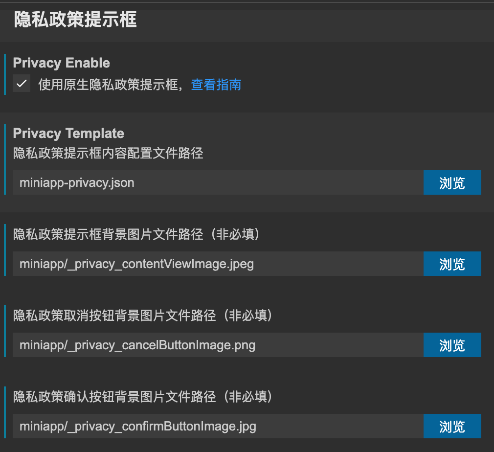 开发者可通过新建一个 JSON 文件来配置隐私弹窗相关信息,例如创建一个 miniapp-privacy.json