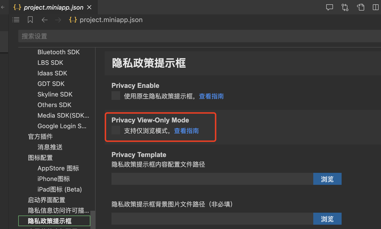 完成内容的 JSON 文件配置后,需通过设置「隐私弹窗内容配置文件路径」加入配置文件。