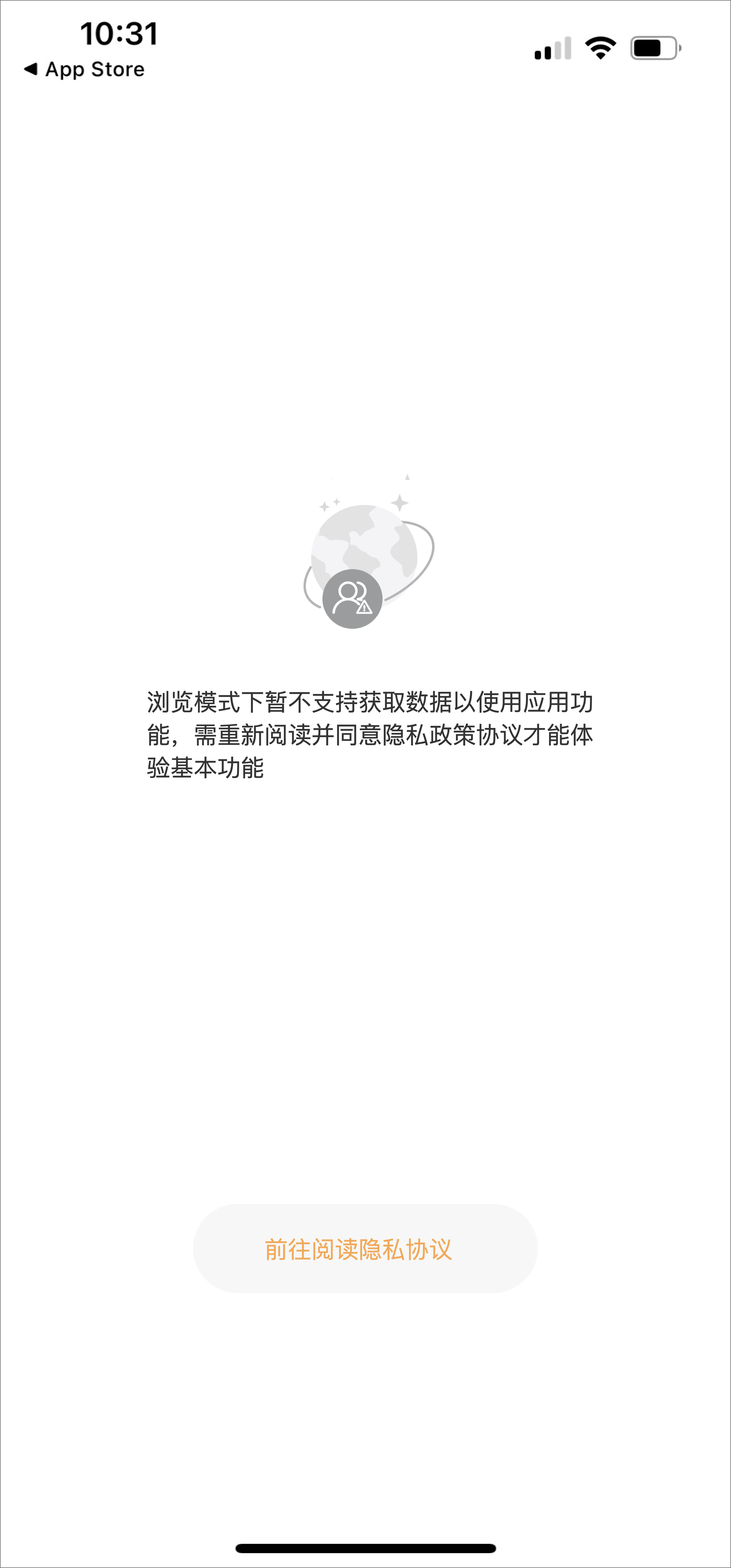 - 如果 SDK < 1.6.2,那么其浏览模式的逻辑为:浏览模式情况下,用户进入的落地页如下,点击「前往阅读隐私协议」即会重新出现隐私协议的弹窗,用户此时如果同意隐私协议即可顺利进入 App