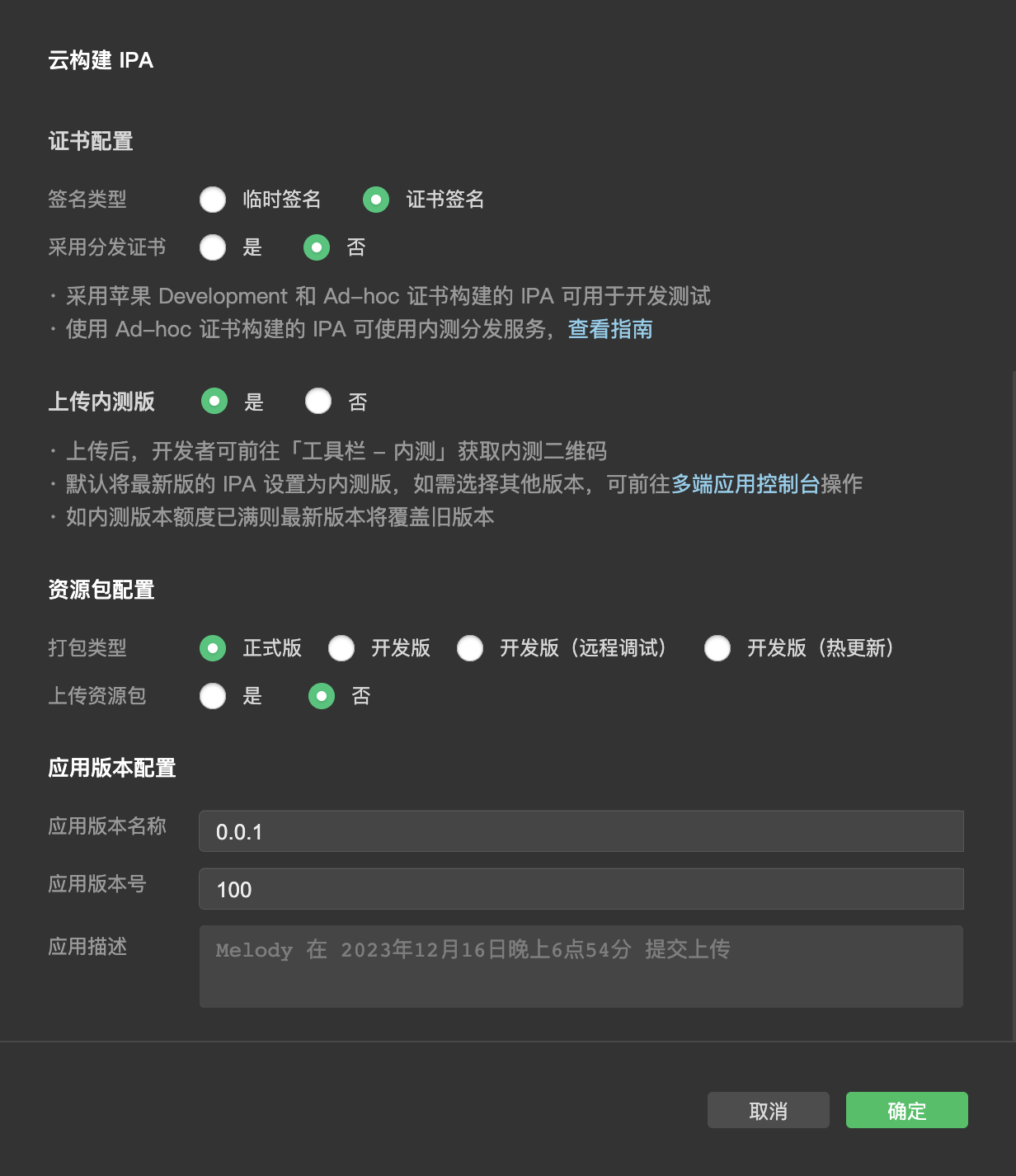 - 前往多端应用模式下的工具栏 - 构建 - 构建 IPA,构建 IPA 时需选择「证书签名」,且证书不能是「分发证书」,详情可查看生成内测分发的 iOS 证书和 Provisioning Profile