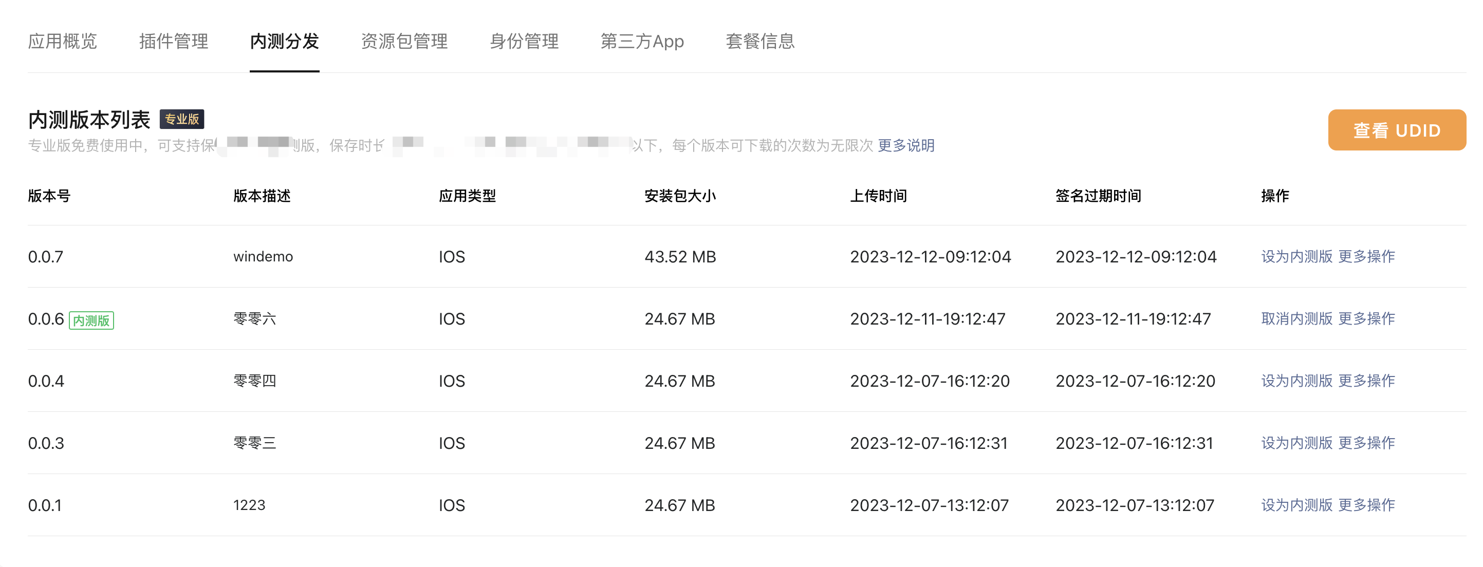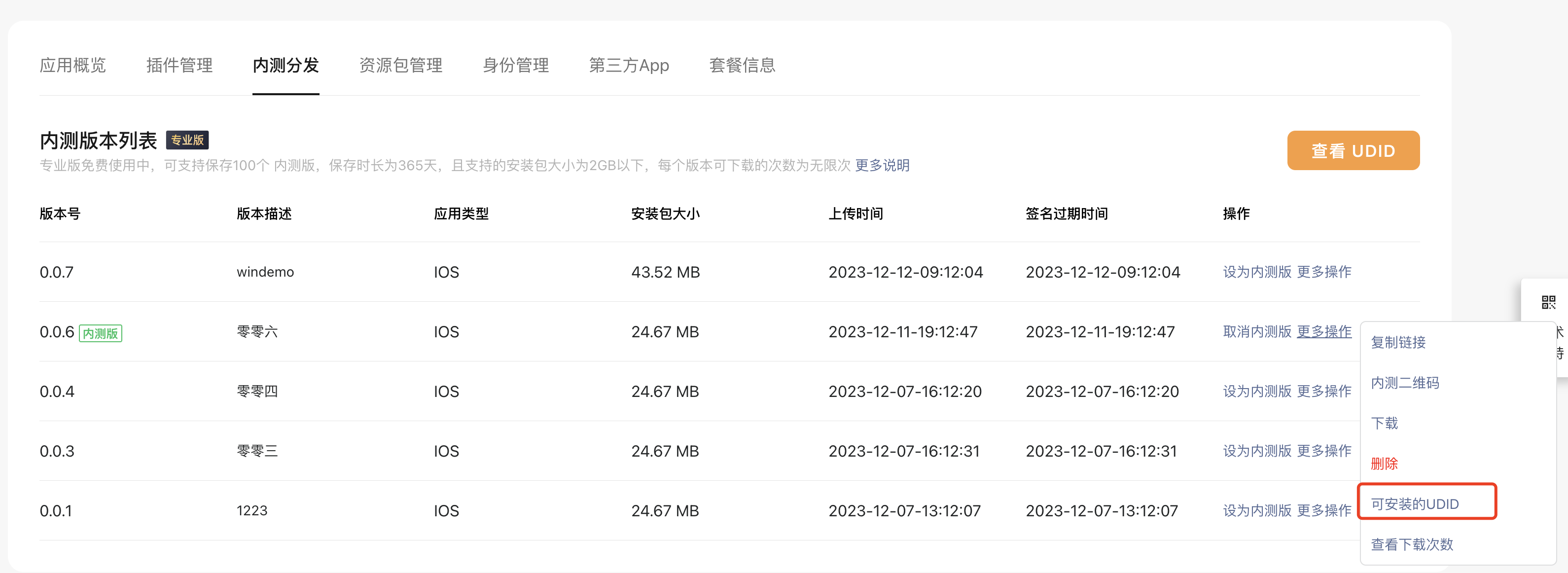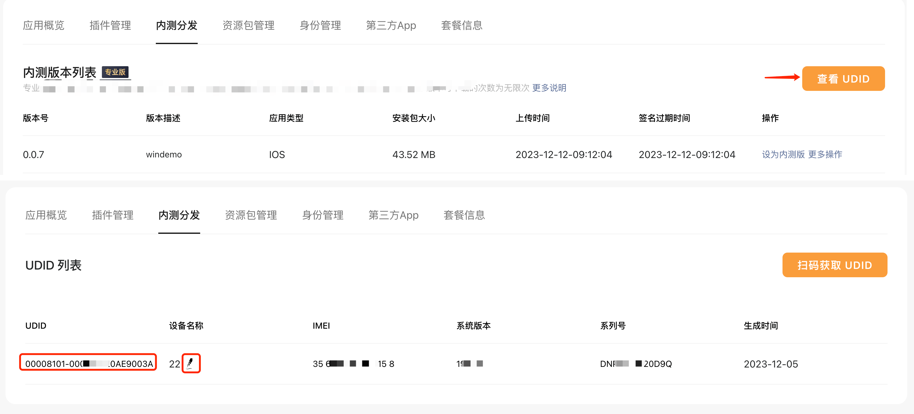 - 因此,开发者可前往多端应用控制台 - 多端应用详情 - 内测分发,查看当前版本可安装的 UDID 列表