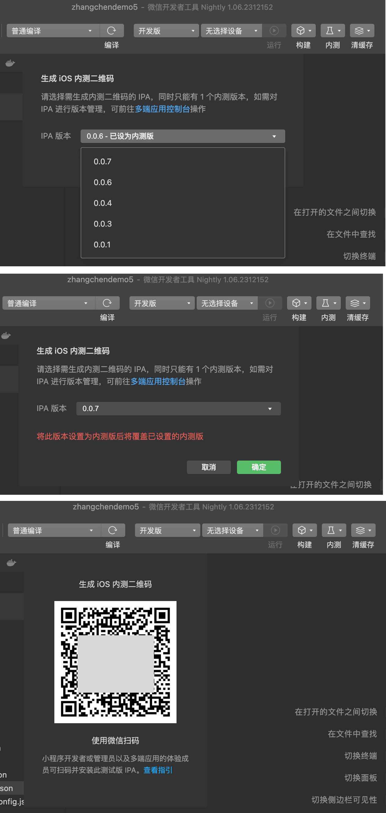 - 此外,也可以直接在微信开发者工具上生成二维码,具体路径为:工具栏 - 内测 - 生成 iOS 内测二维码