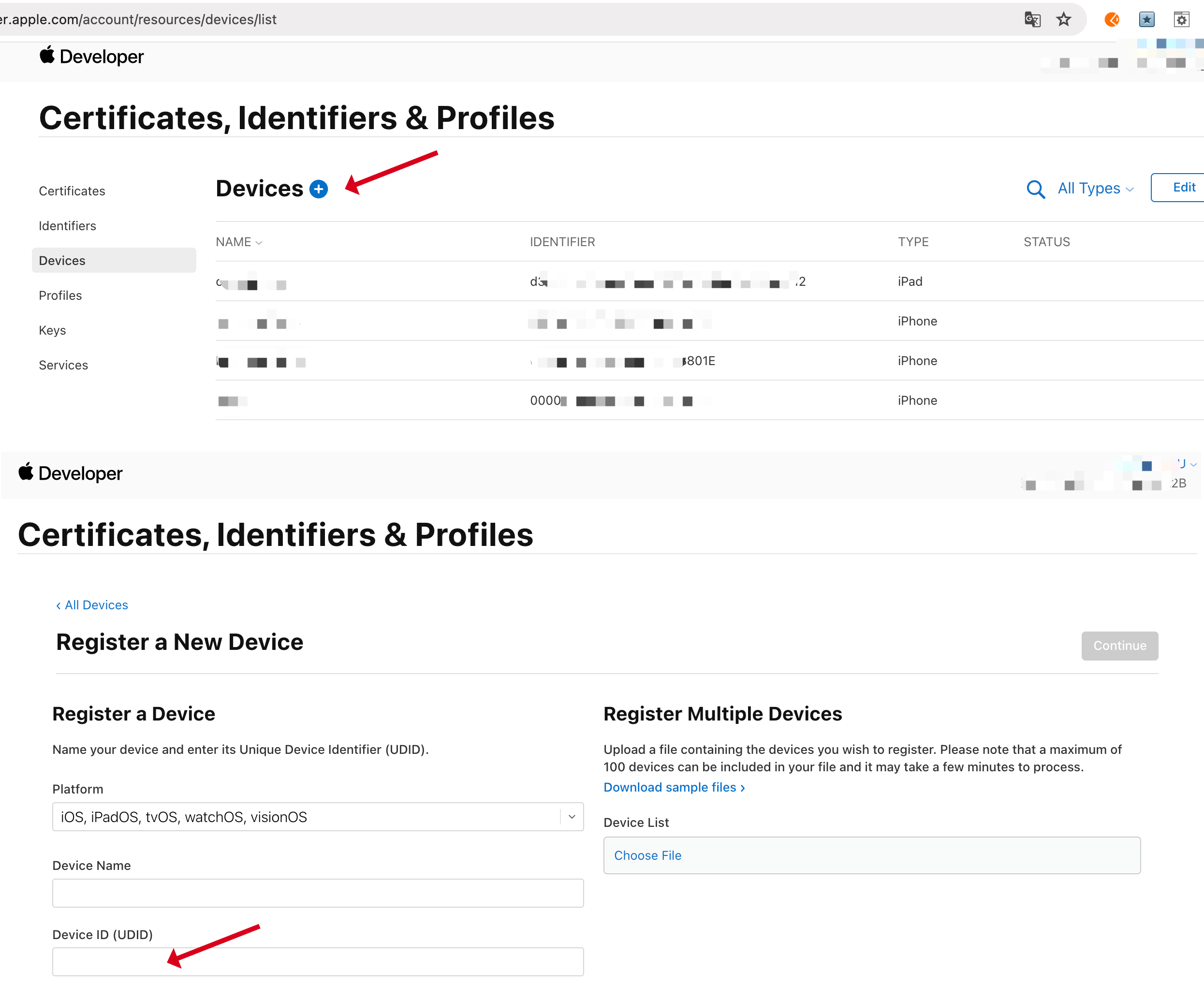 - 登录苹果开发者平台,前往「Certificates, Identifiers & Profiles」 - Devices