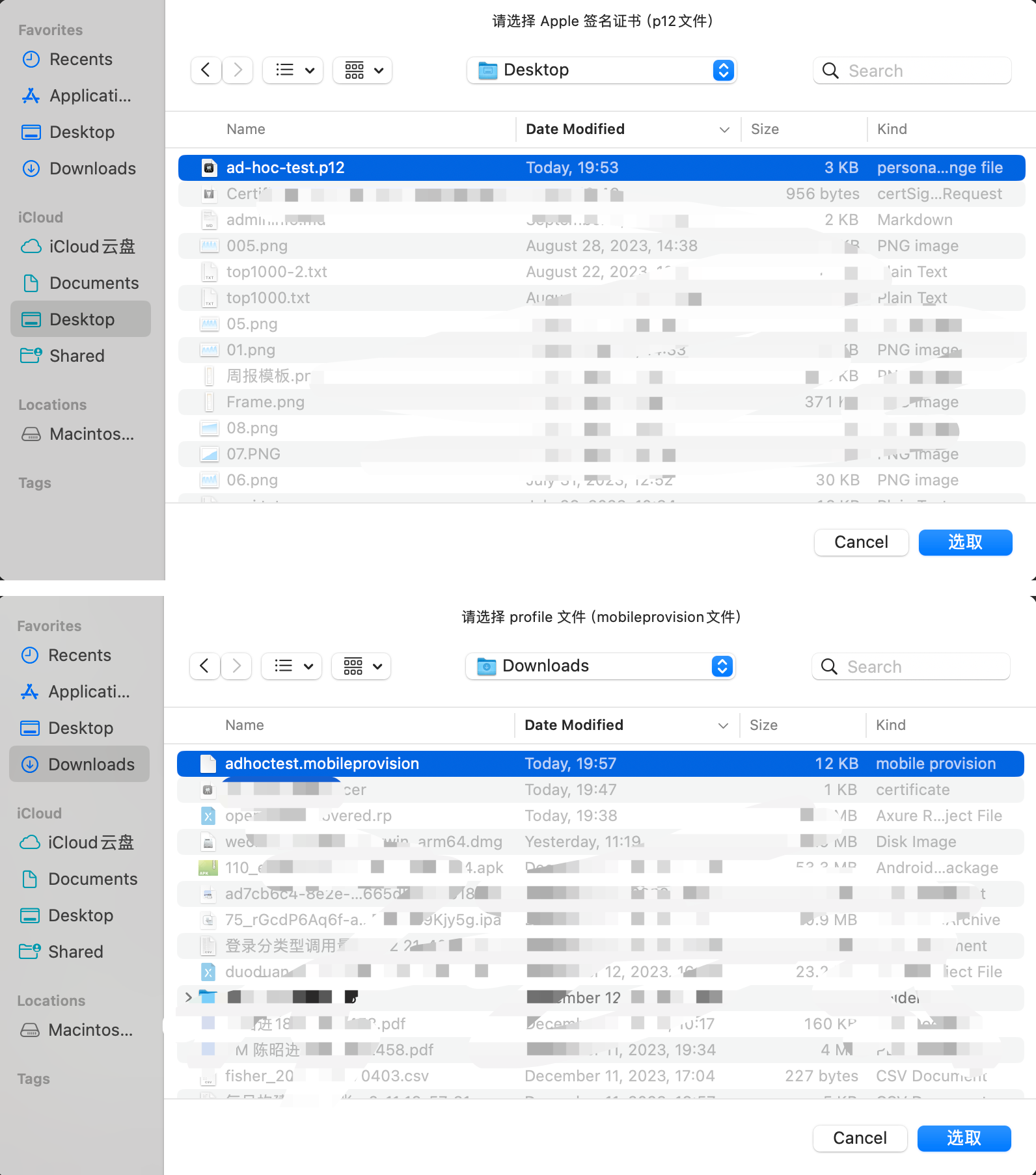 - 完成步骤 2.1 的配置后,点击确定后,开发者工具将开始构建 IPA,此时需要开发者选择 p12 文件,详情可查看生成内测分发的 iOS 证书和 Provisioning Profile