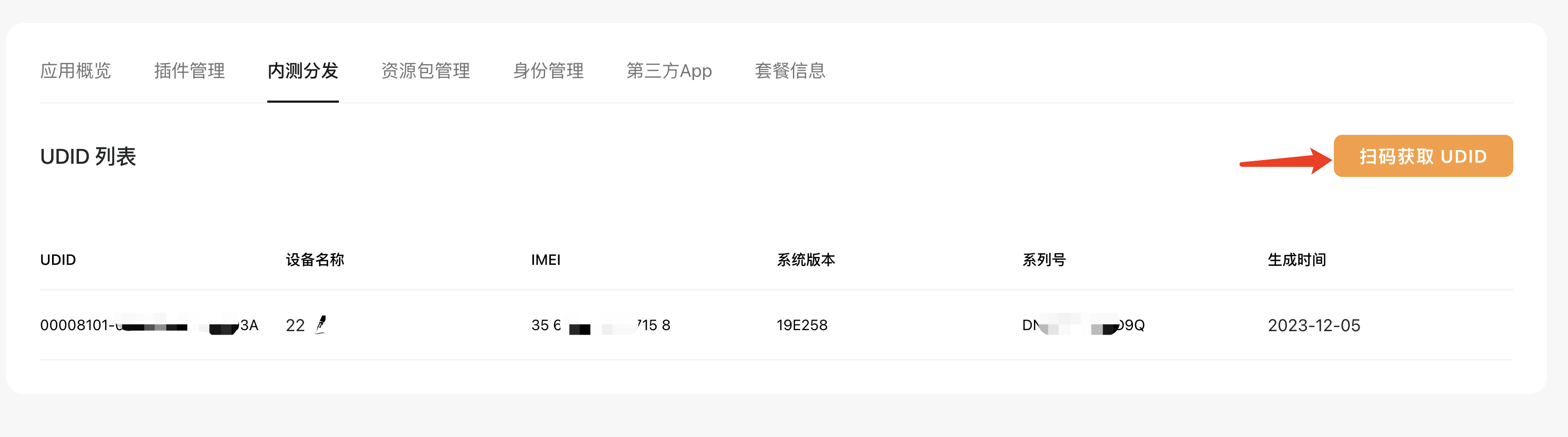 - 用户可前往多端控制台 - 多端应用详情 - 内测分发 - 查看 UDID,然后点击「扫码获取 UDID」获得二维码