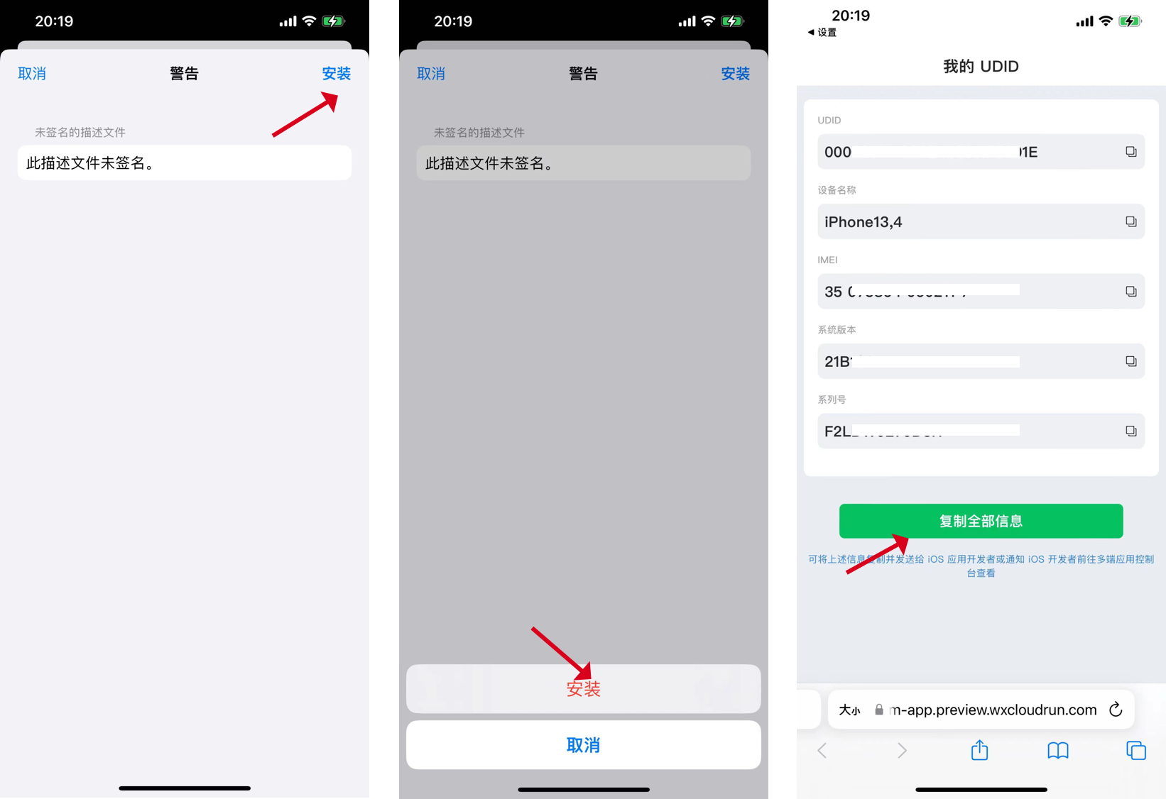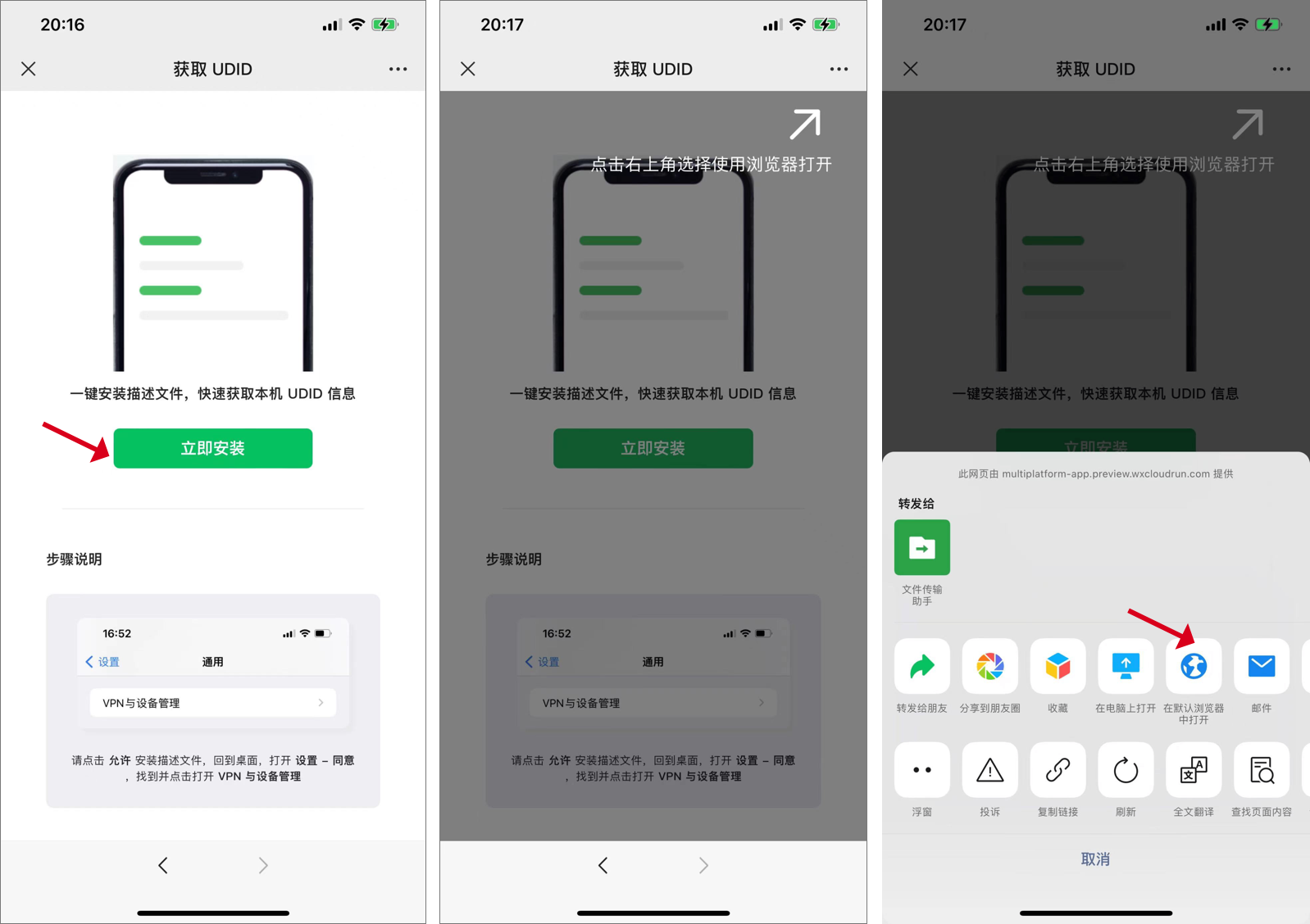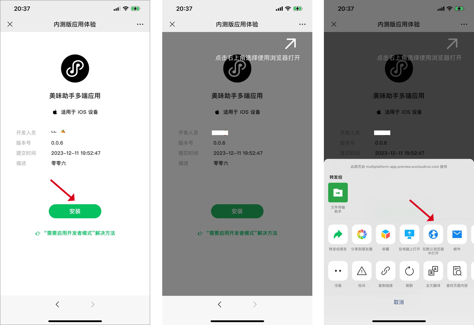 - 可参考上述步骤 2.4 生成并获取内测二维码,测试用户使用微信扫码后,按照界面一步一步操作即可(在微信内选择使用默认浏览器打开)