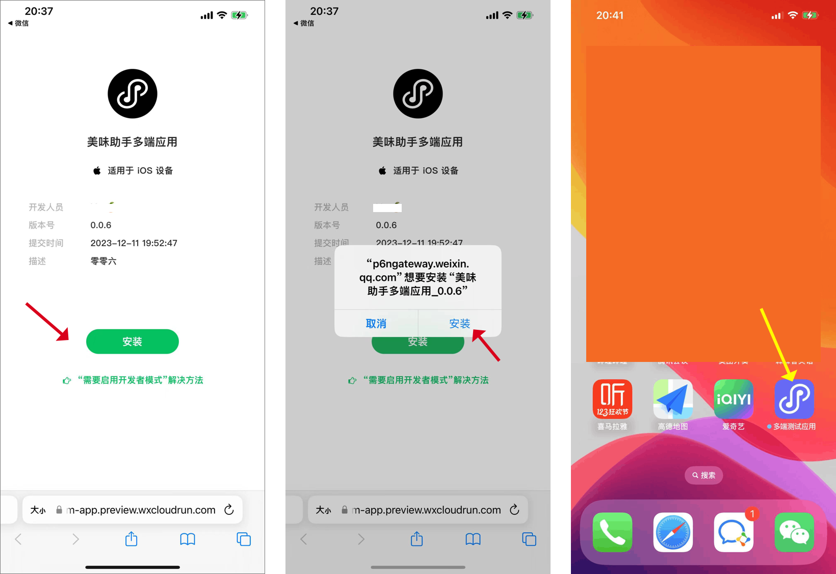 - 待多端应用的开发者向安装包添加设备 UDID 后,用户即可使用微信扫码进入 IPA 下载页,并使用默认浏览器重新打开此IPA 下载页,点击安装,稍等片刻待安装完成即可使用