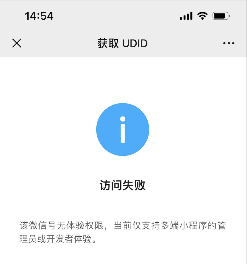 - 将步骤 2.4 生成的内测二维码发送给开发者扫码访问,如果该微信用户不是当前多端应用所绑定的小程序的管理员或开发者,将出现下方报错