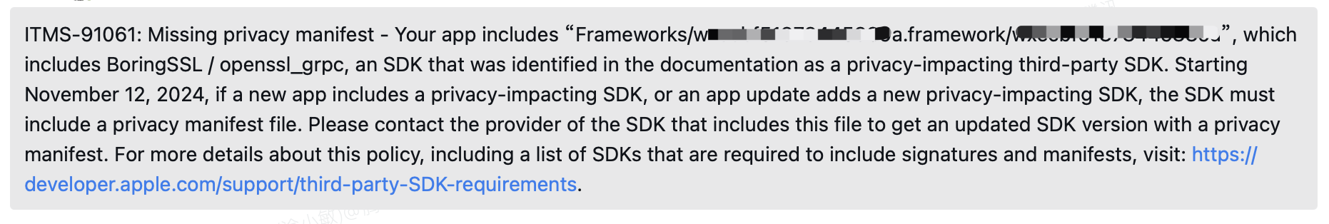 文件,可参考PrivacyInfo.xcprivacy 模板;否则在提交上架的时候会出现类似下方的报错 - 补充,更多信息可前往苹果官网查看Privacy manifest files或者Upcoming third-party SDK requirements