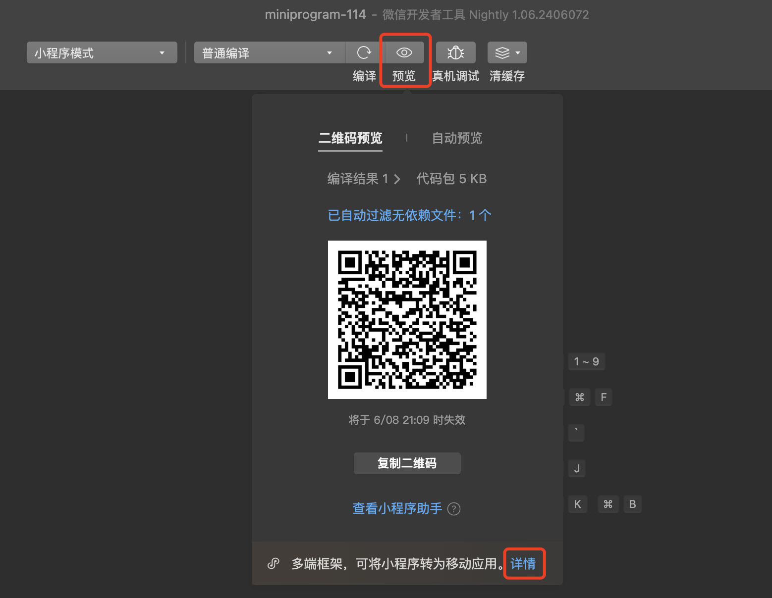 - 在开发者工具的「小程序模式」下,点击「预览」,出现快速构建多端应用的入口后,点击「详情」即可快速构建预览版多端应用