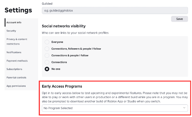 Note: You will not be able to play or work with other users in production or a different build while you are in the program. You will also be prompted to download another build of the Roblox App or Studio when you switch.