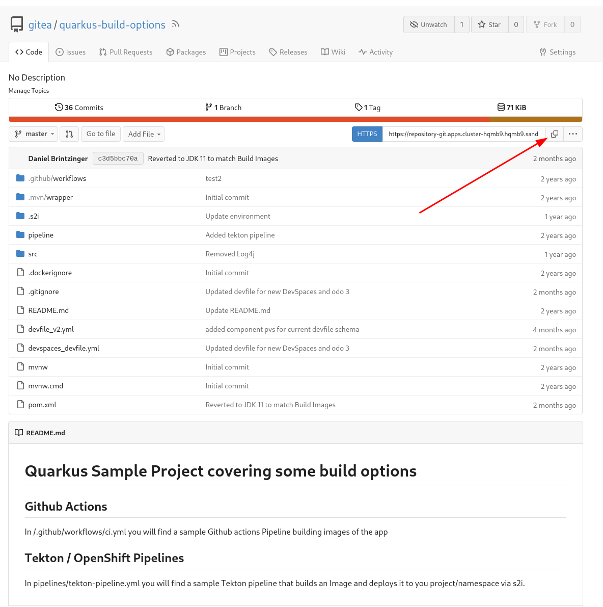 You will now need to access the Gitea repository where your Quarkus app resides and specifically get the path to the devfile.