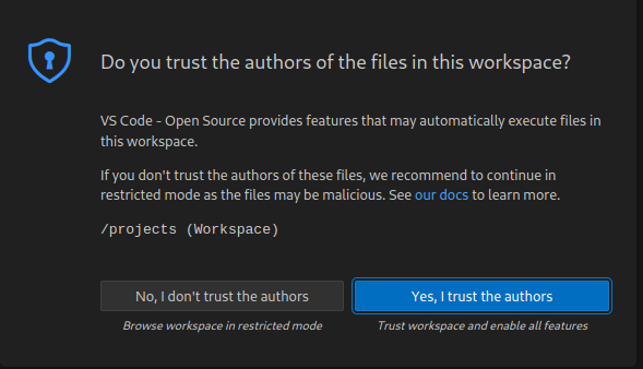 When your workspace has finally started, have a good look around in the UI. It should look familiar if you have ever worked with VSCode or similar IDEs.