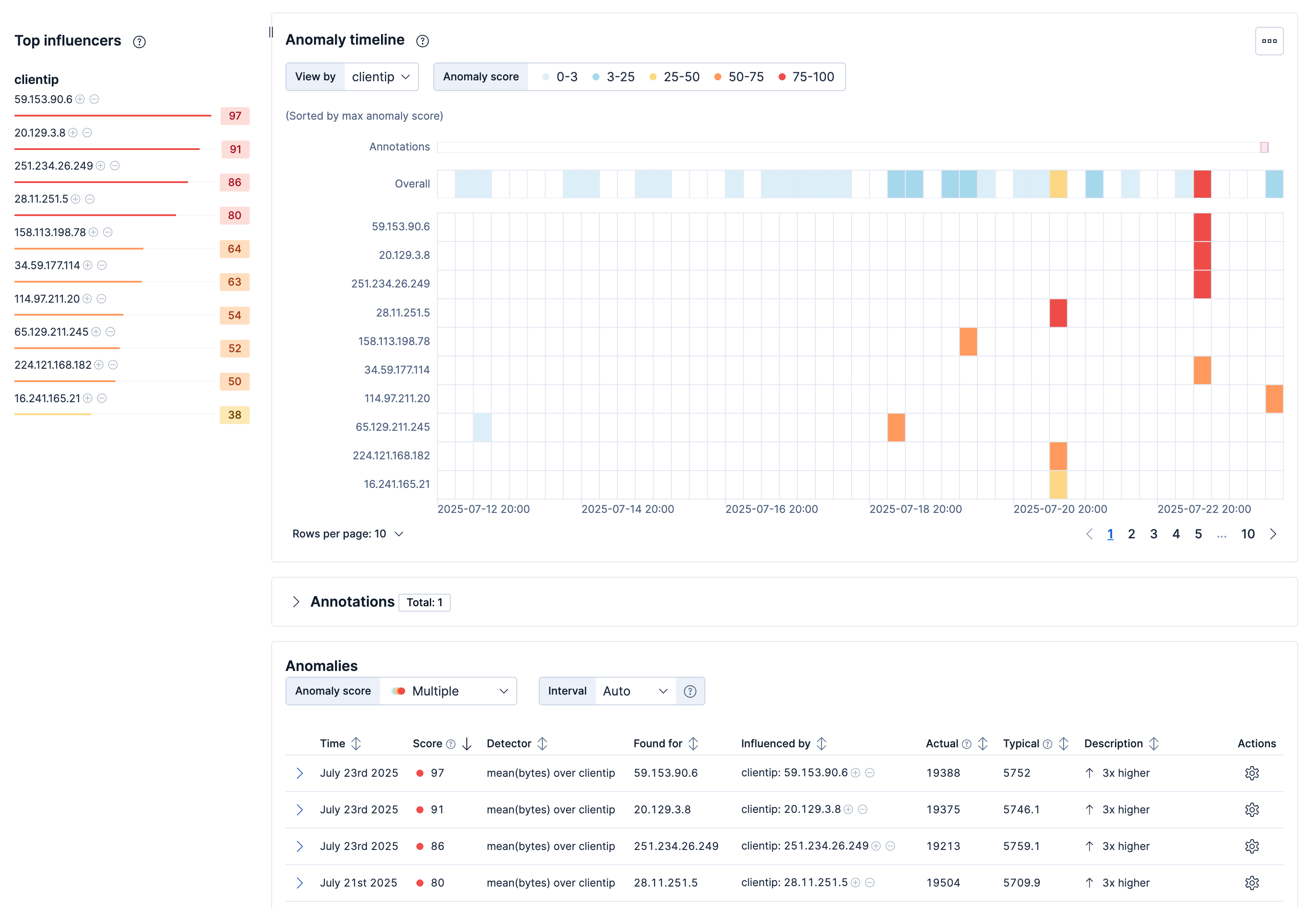 Use the Anomaly Explorer in Kibana to view the analysis results: