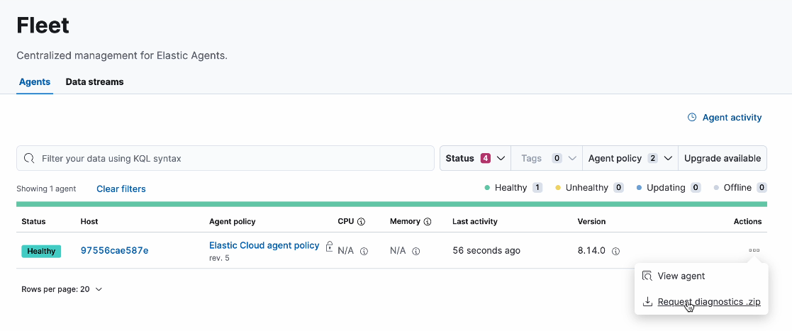 The set of actions available for an agent are limited to viewing the agent and requesting a diagnostics bundle.