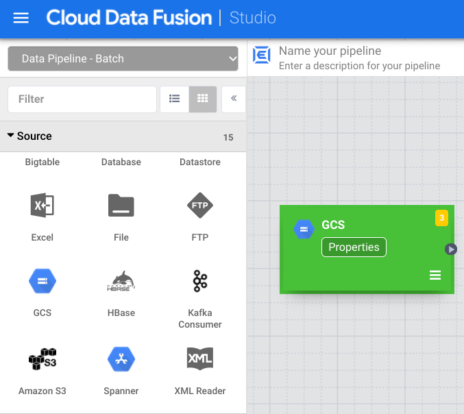 - Click arrow_drop_down Source and select Cloud Storage. The node for a Cloud Storage source appears in the pipeline.