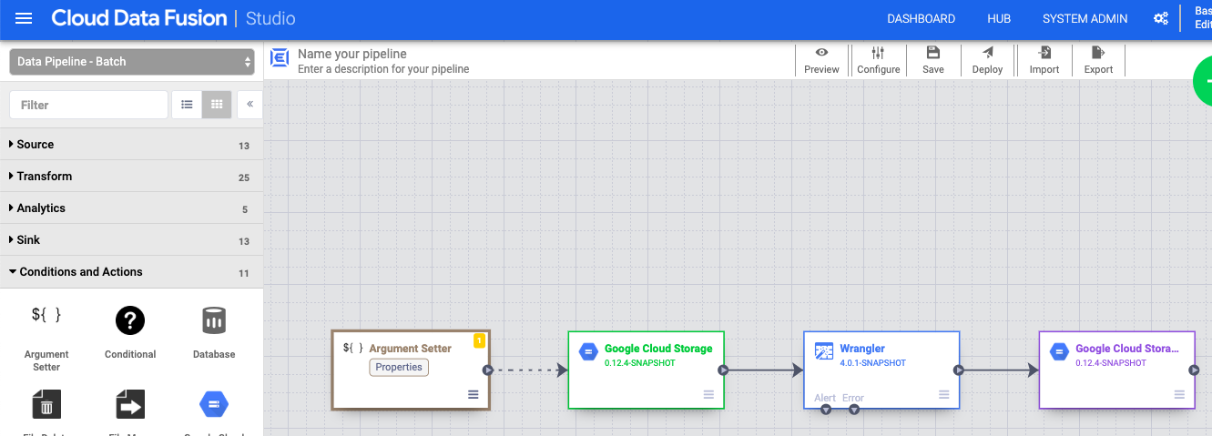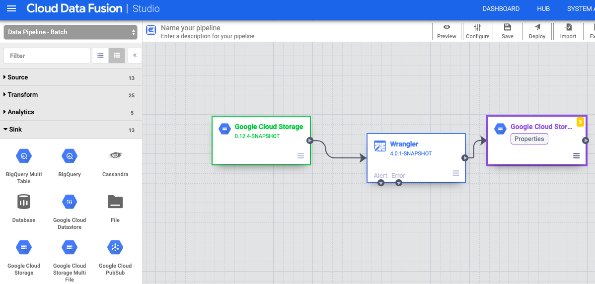 - In the Cloud Data Fusion web interface, go to your data pipeline on the Studio page.