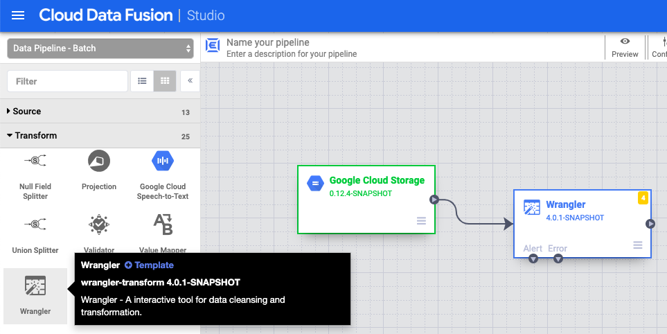 - In the Pipeline Studio canvas, drag an arrow from the Cloud Storage node to the Wrangler node.