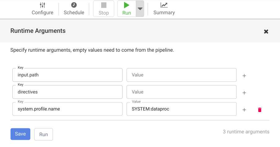 arguments, click the arrow_drop_down drop-down next to Run.Leave the value fields blank to notify Cloud Data Fusion that the Cloud Storage Argument Setter node in the pipeline will set the values of these arguments during runtime.