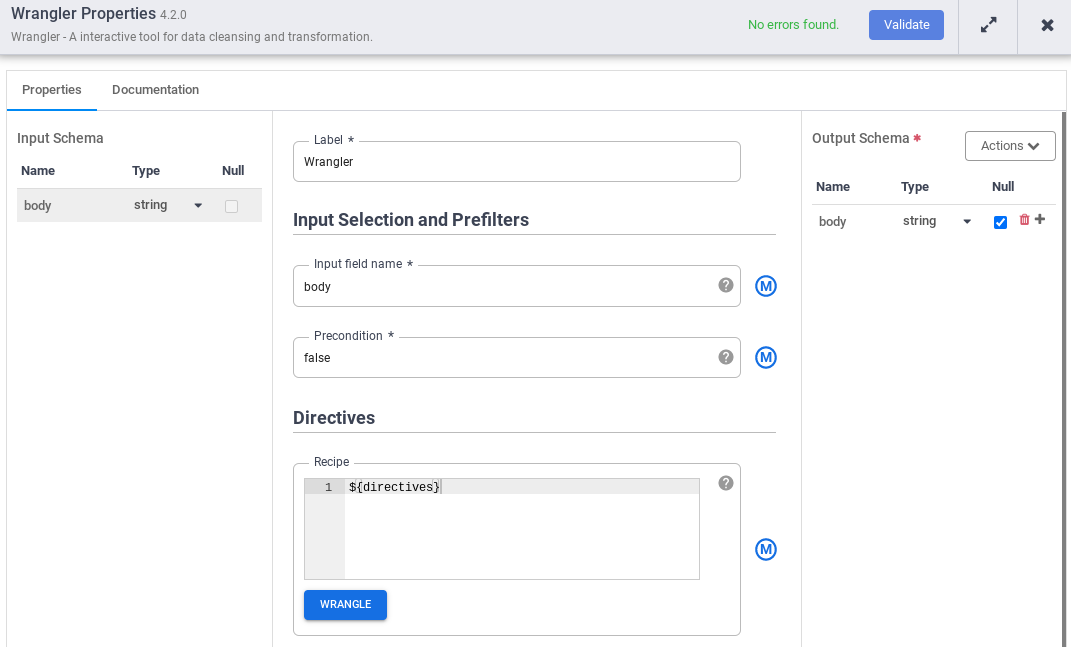 - Go to the Wrangler node in your pipeline and click the Properties.