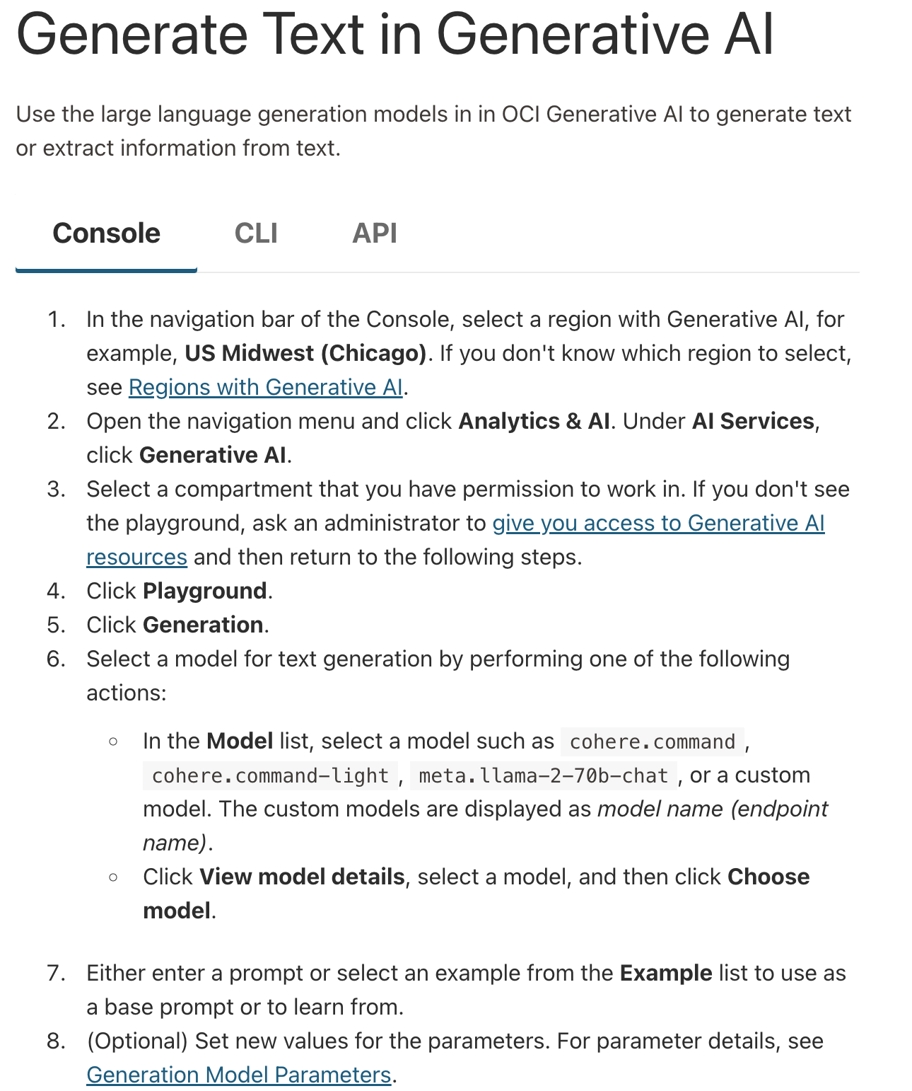 OCI offers a console through which you can perform many generative AI tasks. It allows you to select your region and the model you wish to use, then pass a prompt to the underlying model, configuring parameters as you wish.