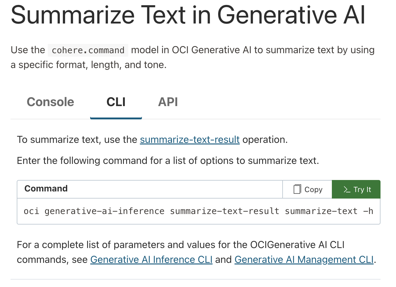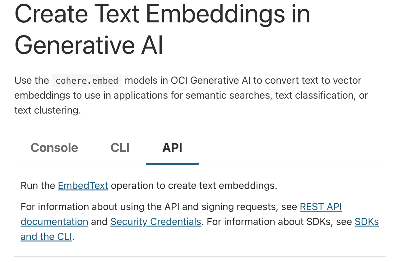 If you’re trying to use Cohere models on OCI programmatically — i.e. as part of software development, or while building an application — you’ll likely want to use the API.