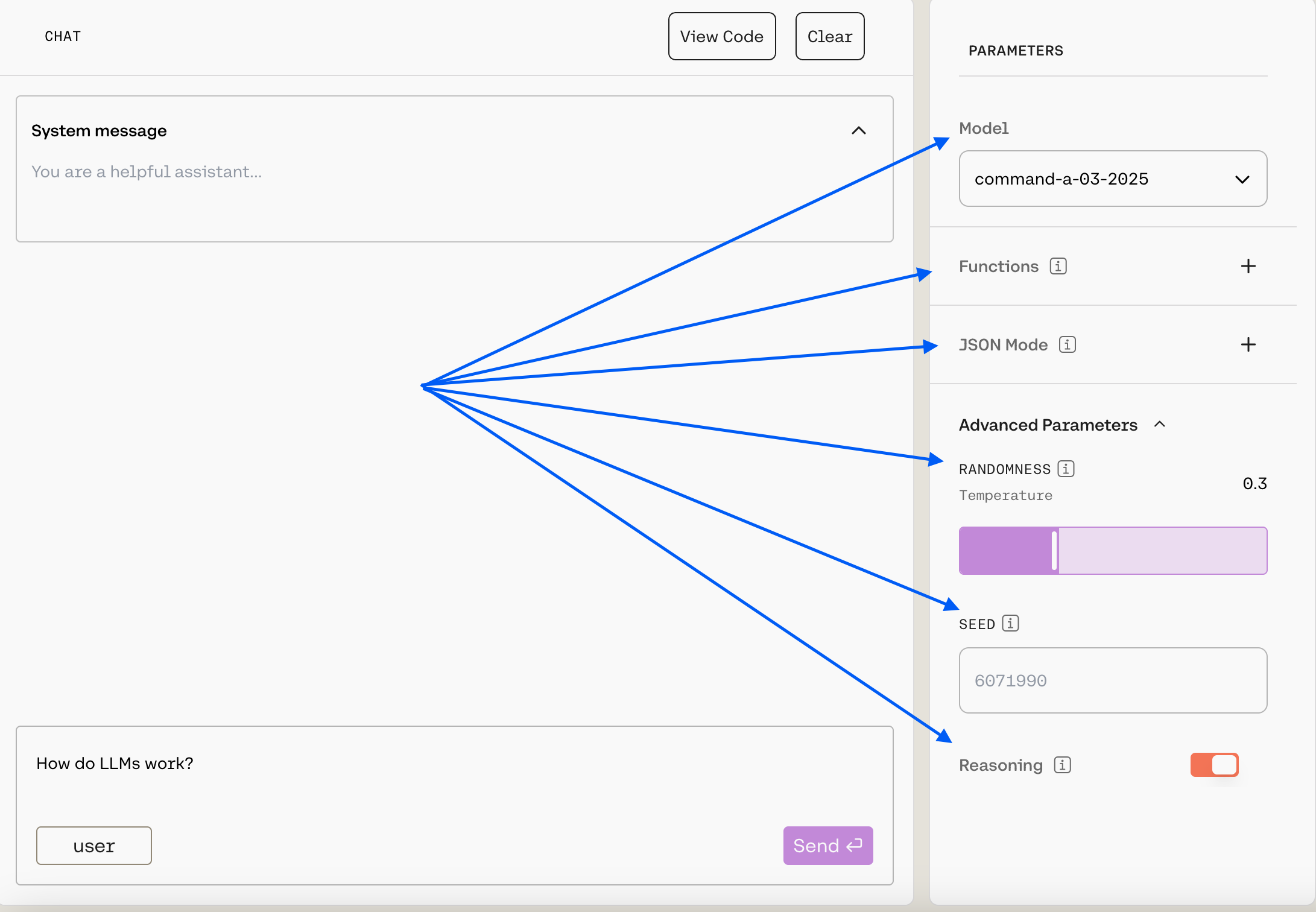 Model: Choose from a list of our generation models (we recommendcommand-a-03-2025, the default).Functions: Function calling allows developers to connect models to external functions like APIs, databases, etc., take actions in them, and return results for users to interact with. Learn more in tool use docs.JSON Mode: This is part of Cohere’s structured output functionality. When enabled, the model’s response will be a JSON object that matched the schema that you have supplied. Learn more in JSON mode.- Under