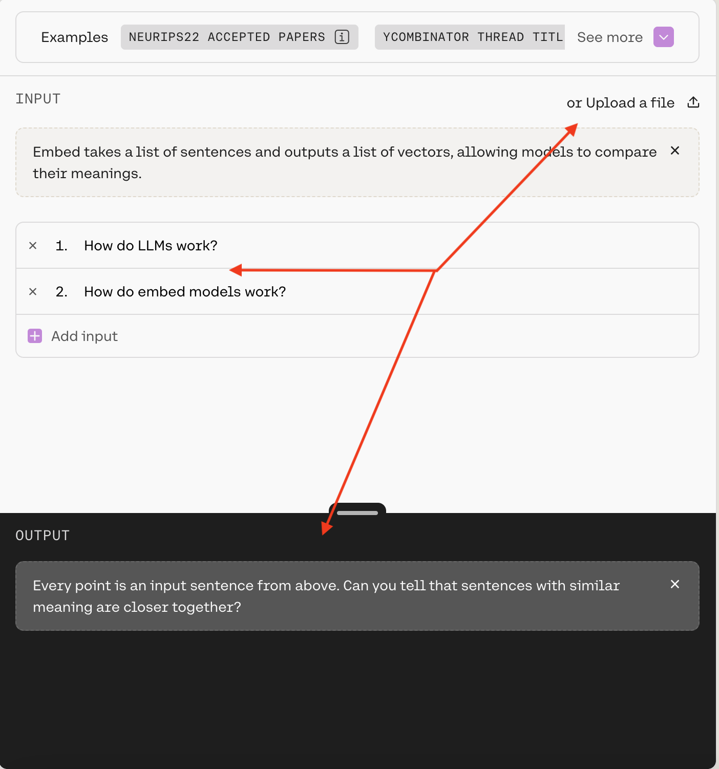 To create embeddings through the Playground, you can either use Add input to feed the model your own strings, or you can use Upload a file. If you select Run, you’ll see the two-dimensional visualization of the strings in the OUTPUT box.