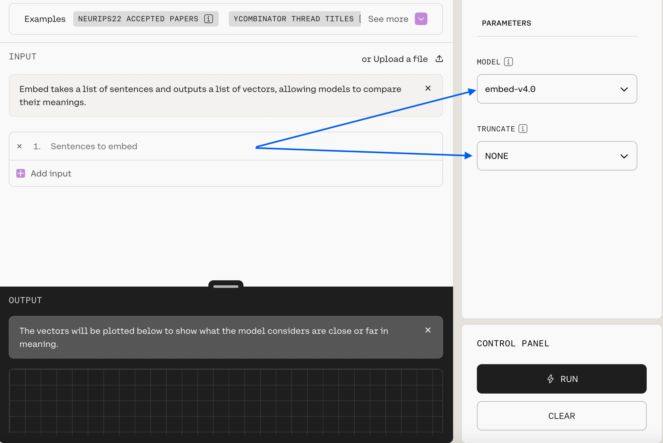 Model: Choose from a list of our embedding models (we recommendembed-v4.0, the default).Truncate: This allows you to specify how the API will handle inputs longer than the maximum token length.