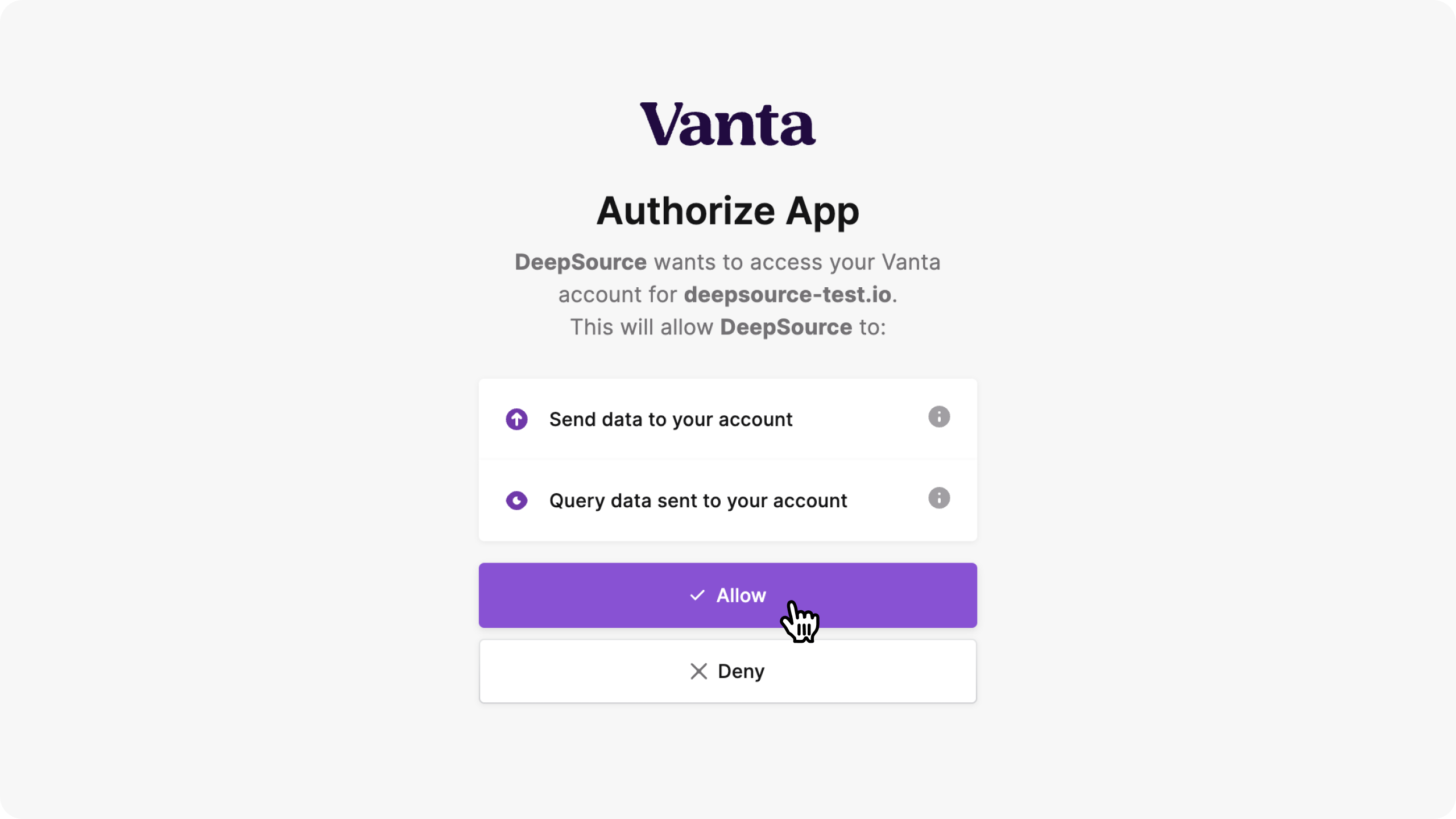 - Click on the ‘Allow’ button to grant permissions to DeepSource from your Vanta account. Make sure that you’re connecting the right workspace to your Vanta account.
