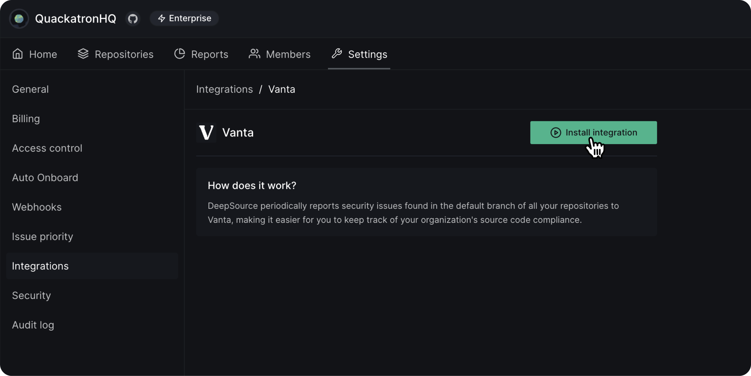 Skip to main content Vanta is an industry leader in compliance automation and is trusted by thousands of companies. They simplify the complex, time-consuming process of preparing for SOC 2, ISO 27001, and several other compliances, and automate the implementation and monitoring of controls, which not only reduces the risk of data breaches but also gives you the security credibility you need. DeepSource periodically reports security issues found in the default branch of all your repositories to Vanta, including both code vulnerabilities (SAST) and vulnerable dependencies (SCA), making it easier for you to keep track of your organization’s source code compliance. Installation
