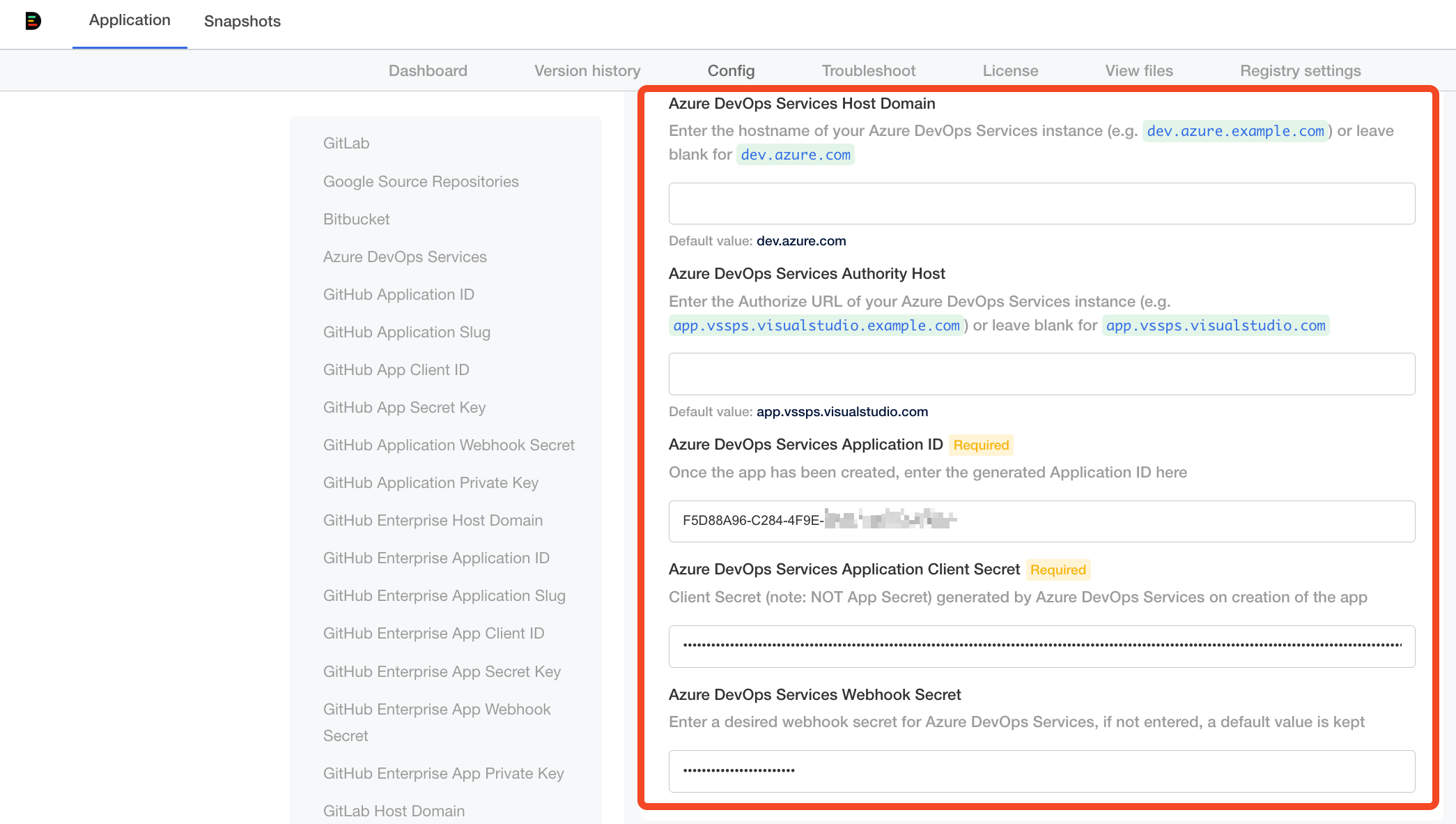 -  Fill in the values for the following fields as explained in each field’s subtext: - Azure DevOps Services Host Domain