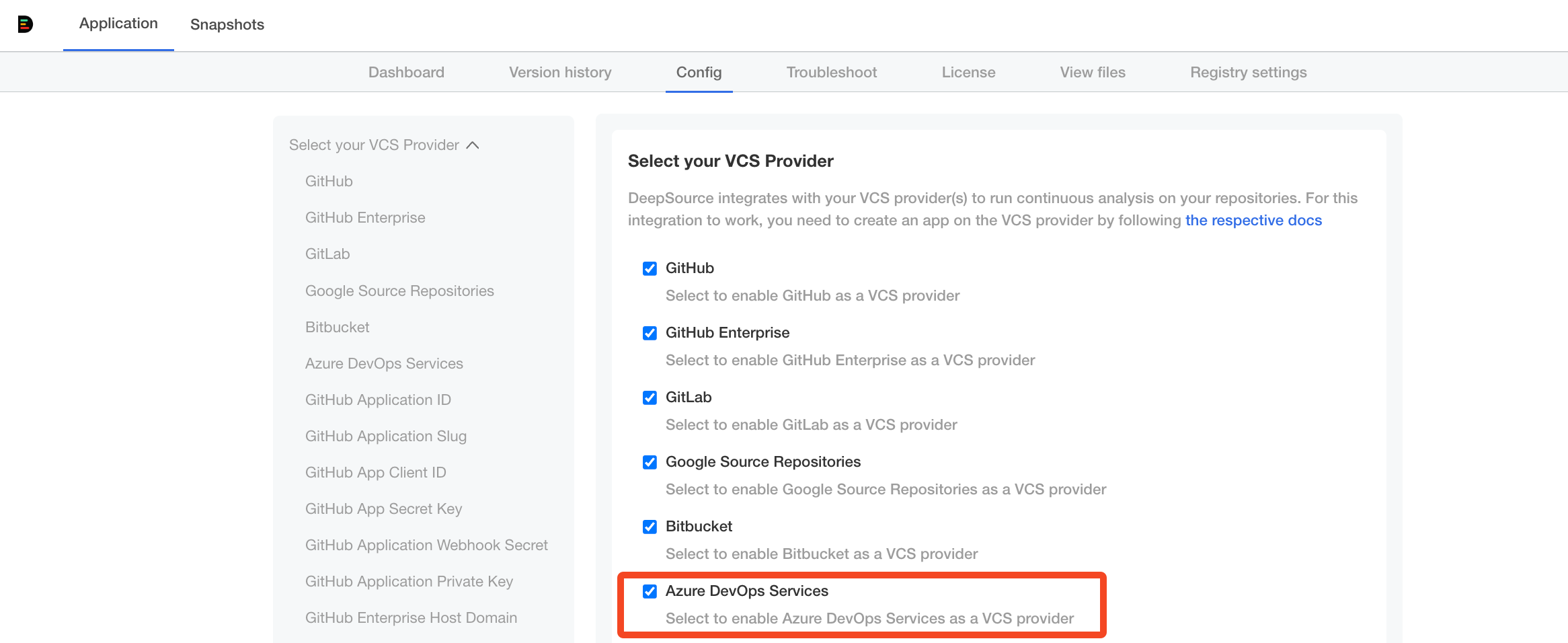 After you have created your Azure DevOps application, you need to configure it in the DeepSource Admin Console.- Visit the Admin Console