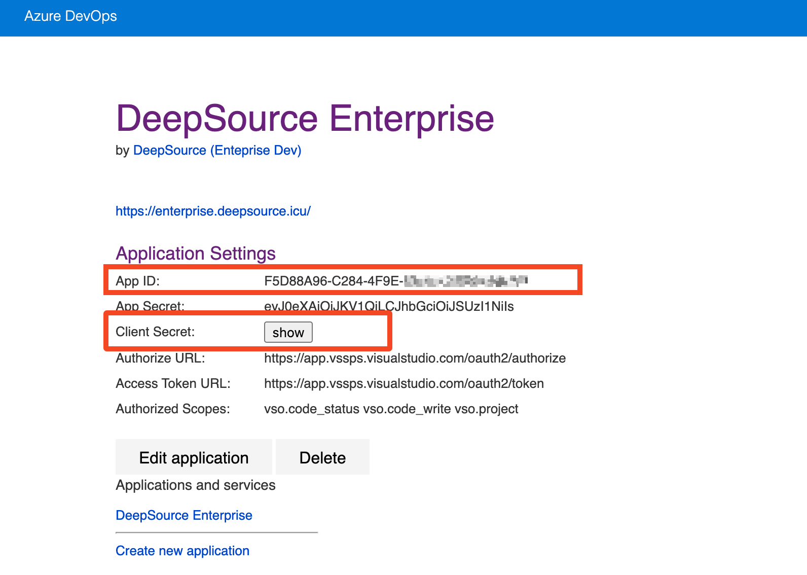 - On the next page, You will get theApp ID,Client SecretandAuthorize URL. Enter these values in the DeepSource Enterprise admin console.