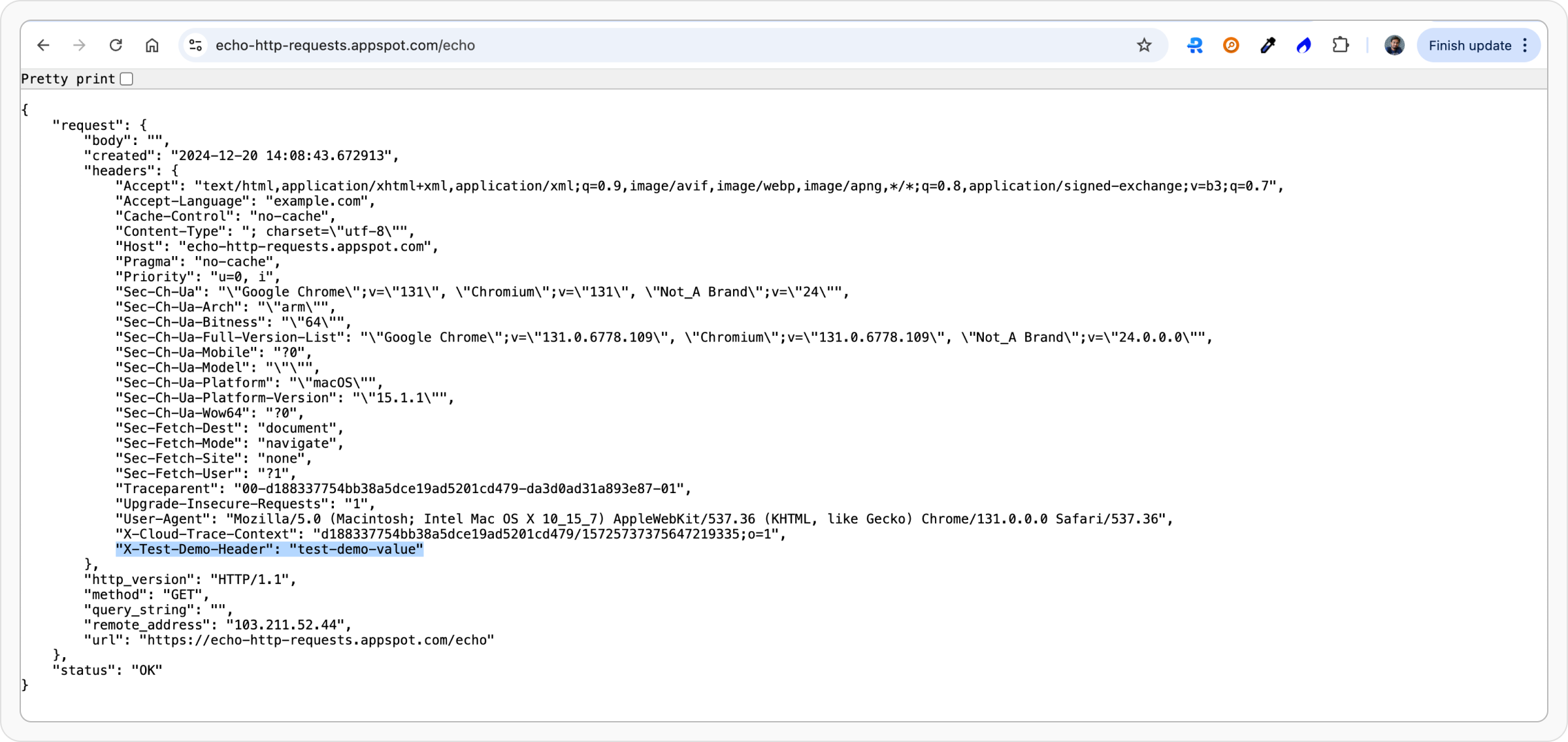 Let’s use an echo endpoint that returns request headers, body, query params etc as JSON response.