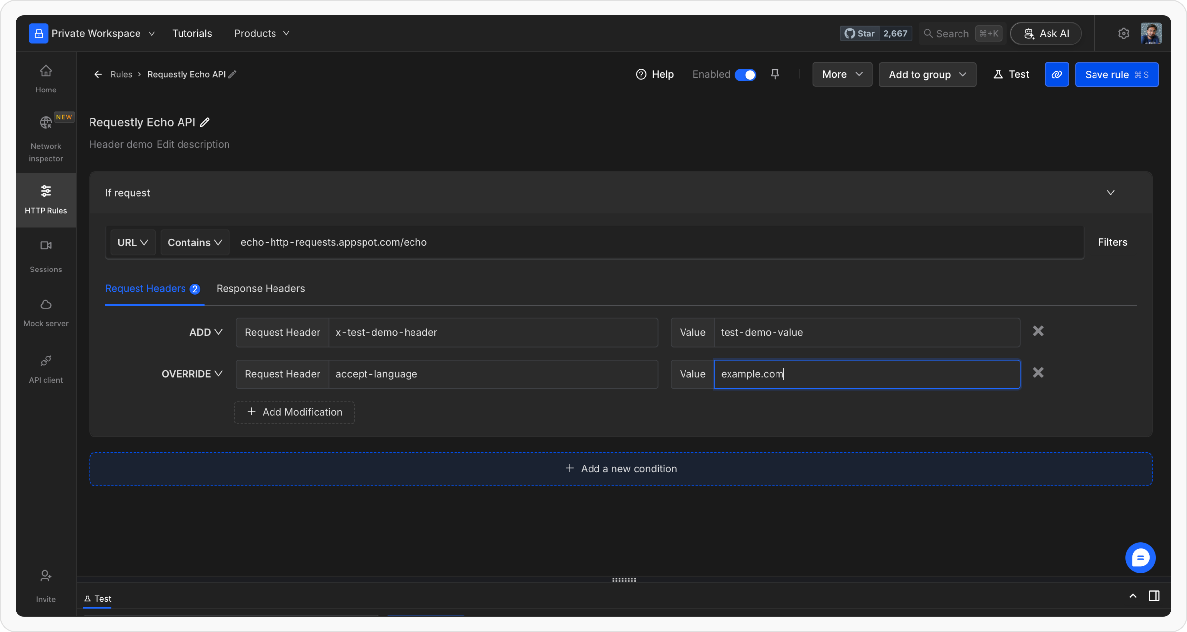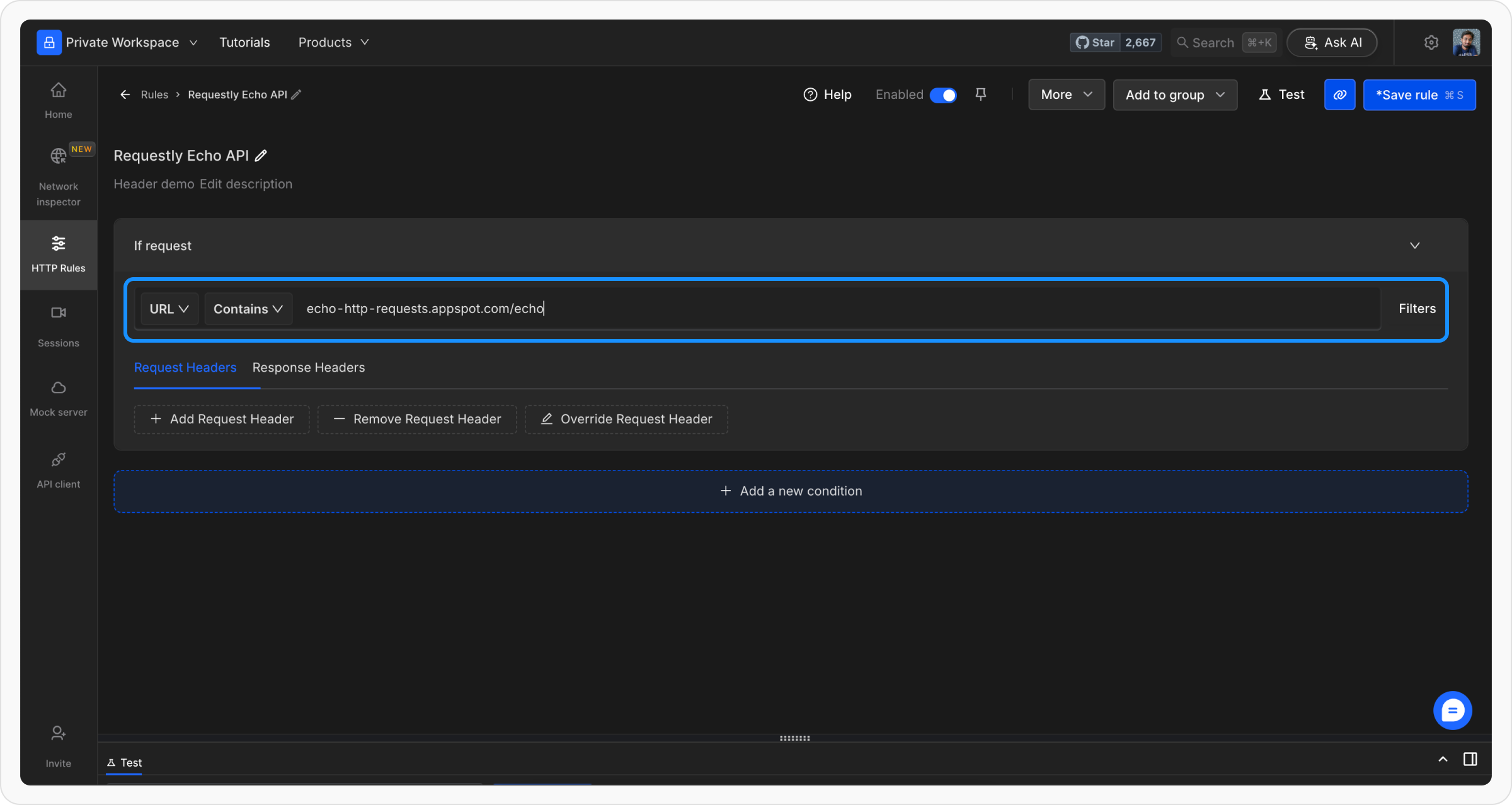 Add conditions using Source Condition and Source Filters to target specific requests. Conditions can include URL, Host, or Path with matching options such as Regex, Contains, Wildcard, or Equals.