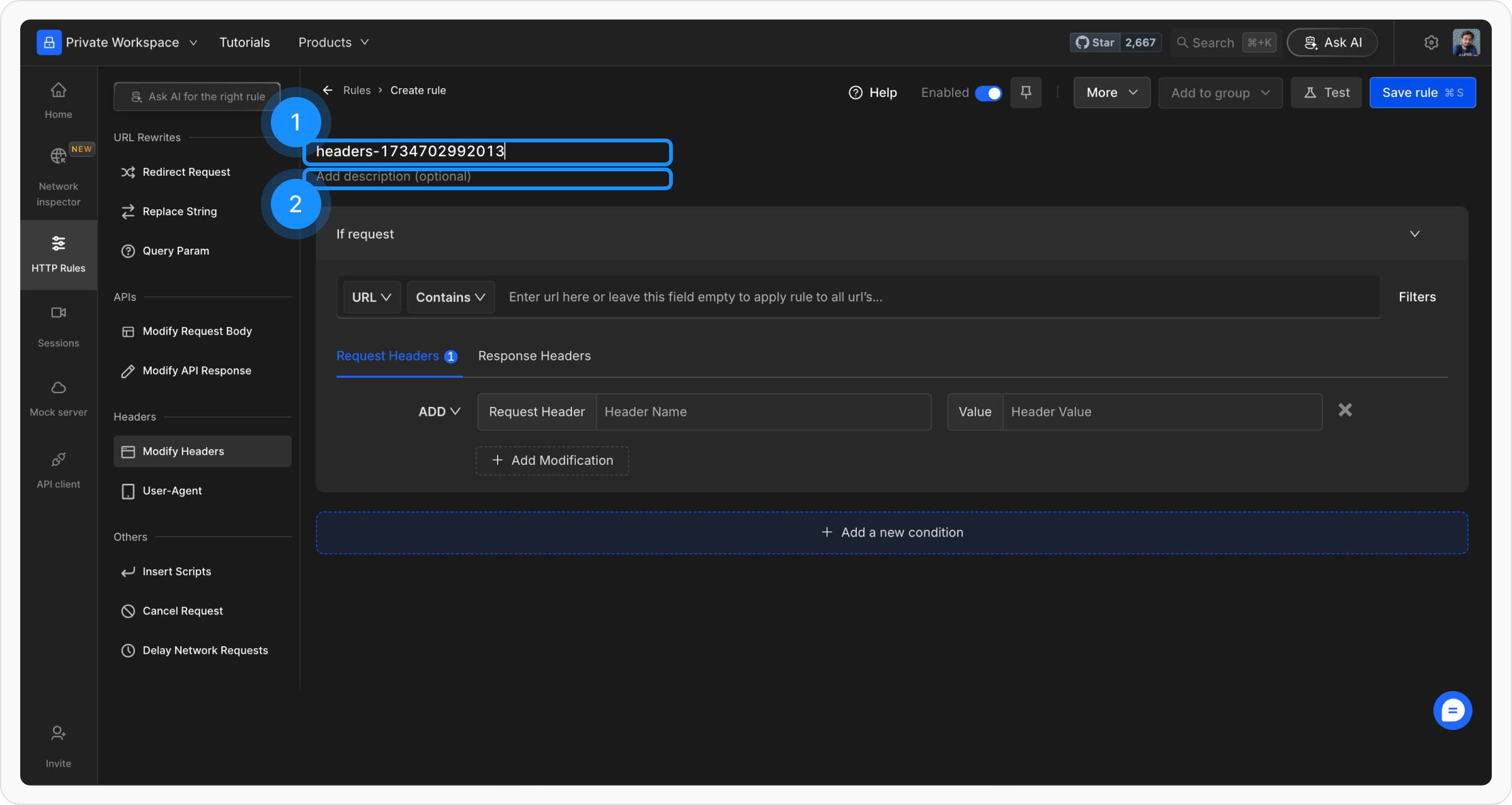 In this step, you can select the option to modify. It rule allows you to edit both the request and the response headers.