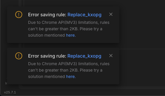 If the error message mentions “Invalid regex” or unsupported syntax such as lookaheads, it means the pattern is not compatible with the regex engine we use.Requestly uses RE2-compatible regular expressions, as required by Chrome’s Manifest V3 security model.