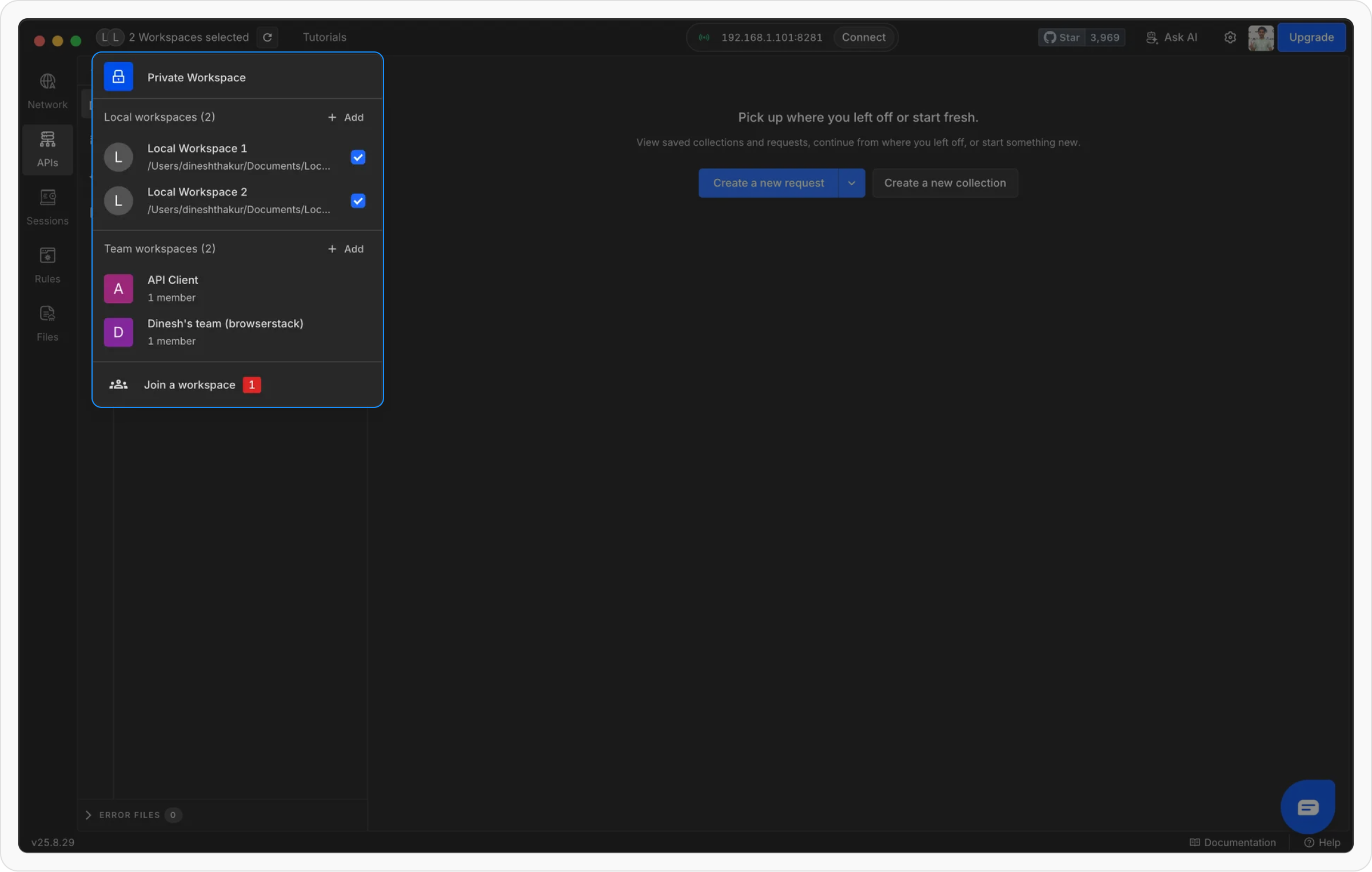 When working with multiple workspaces, each workspace keeps its own separate environment. This ensures that variables from one workspace do not interfere with another.Switching Environments