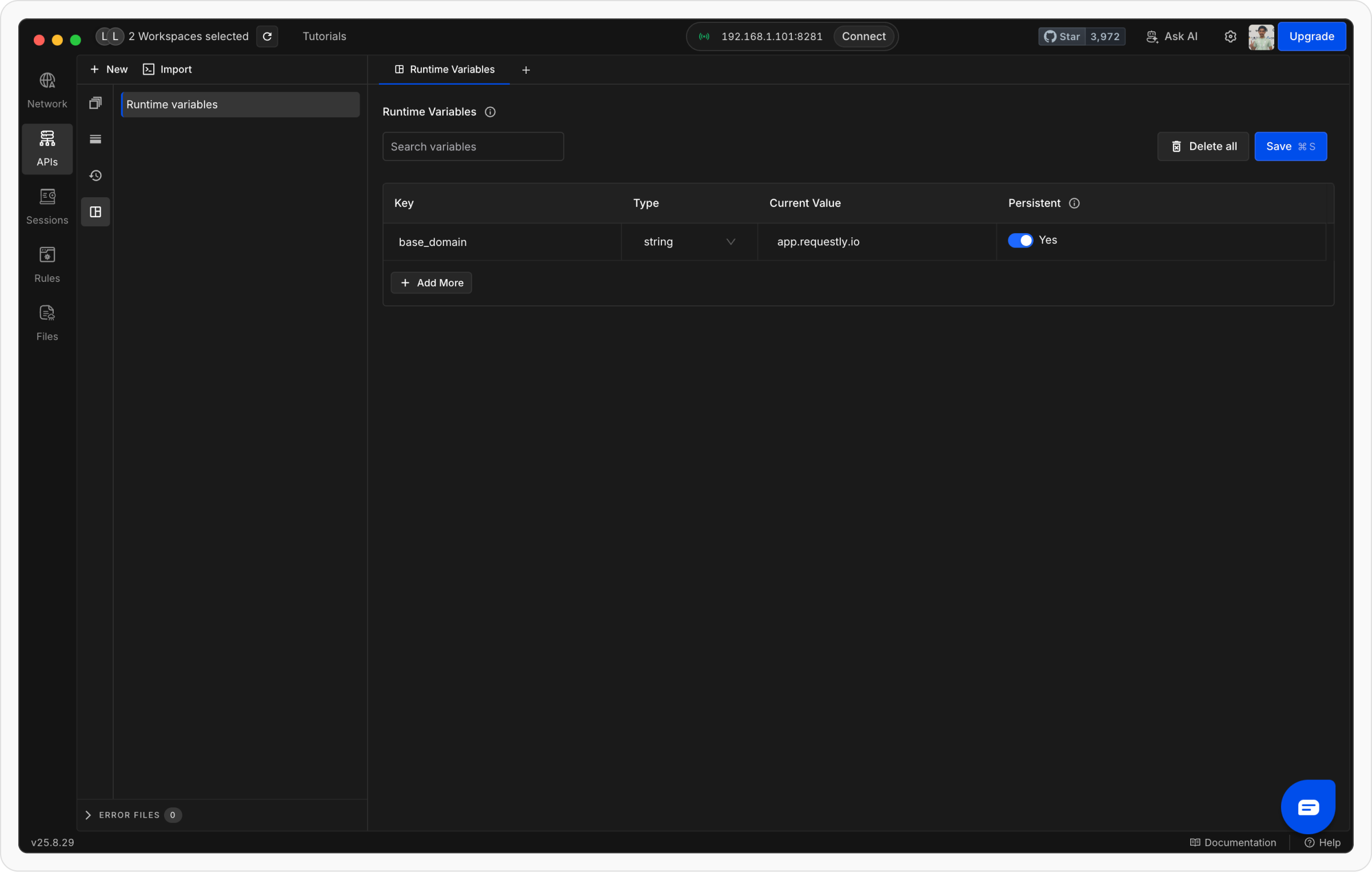 To share values (like tokens) across different workspaces, you can use Runtime Variables. These act as super-global variables that are accessible across all workspaces. They can be created as temporary values for quick testing or persisted for longer use. You can view, edit, or clear them anytime from the Runtime Variables tab on the left.
