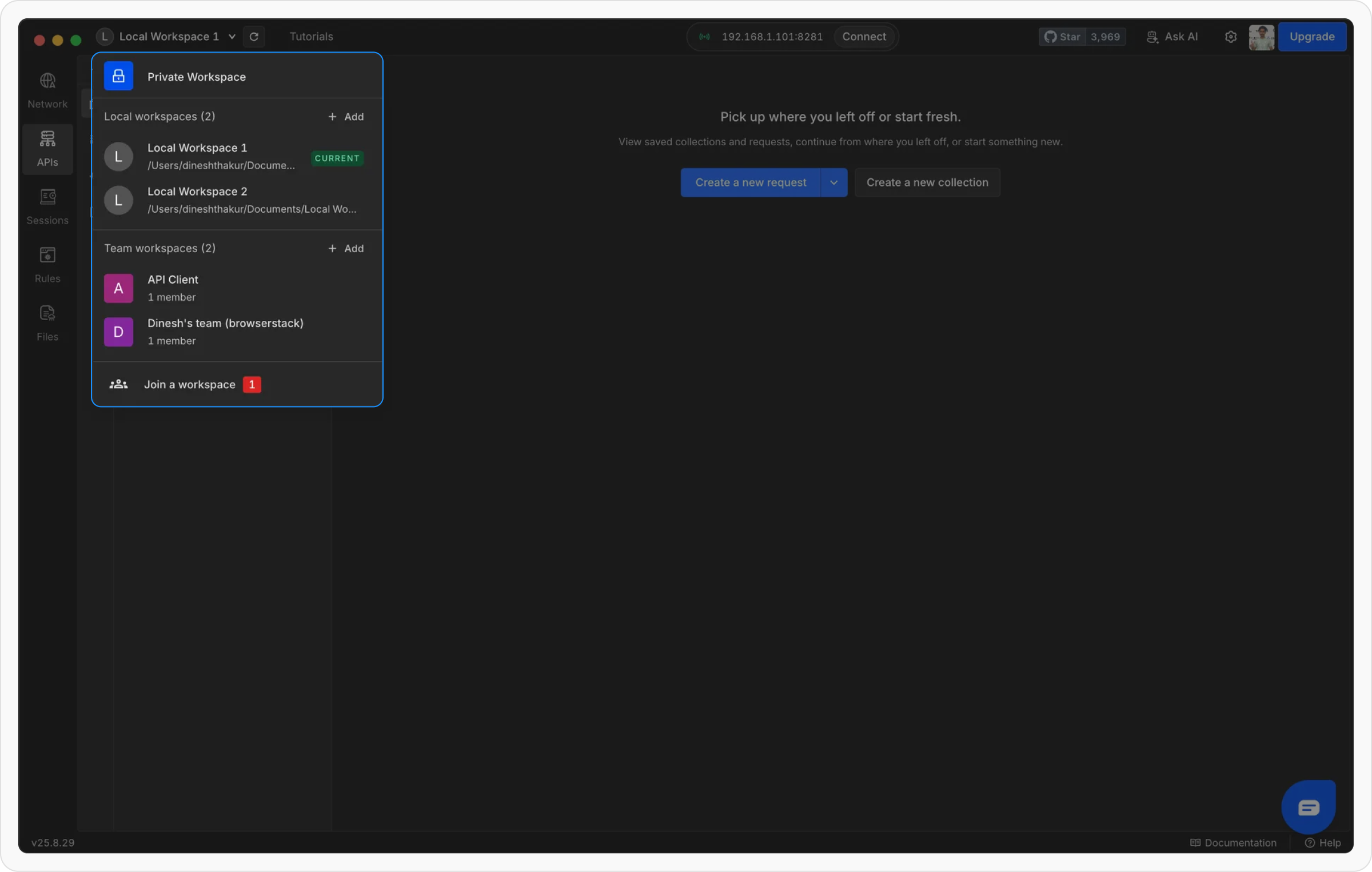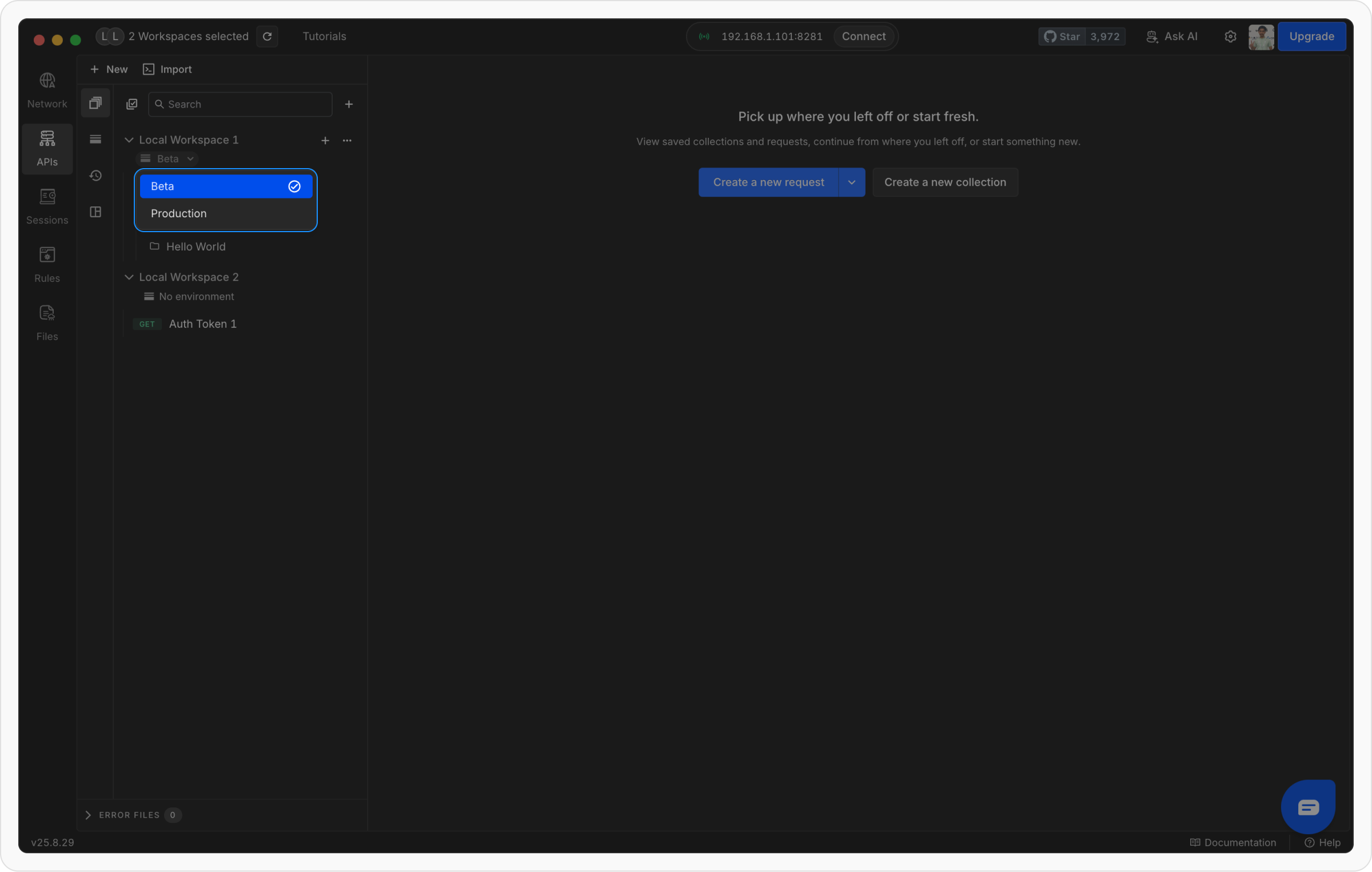You can switch environments using the dropdown below the workspace name in the sidebar. This lets you quickly toggle between different setups for the same workspace.