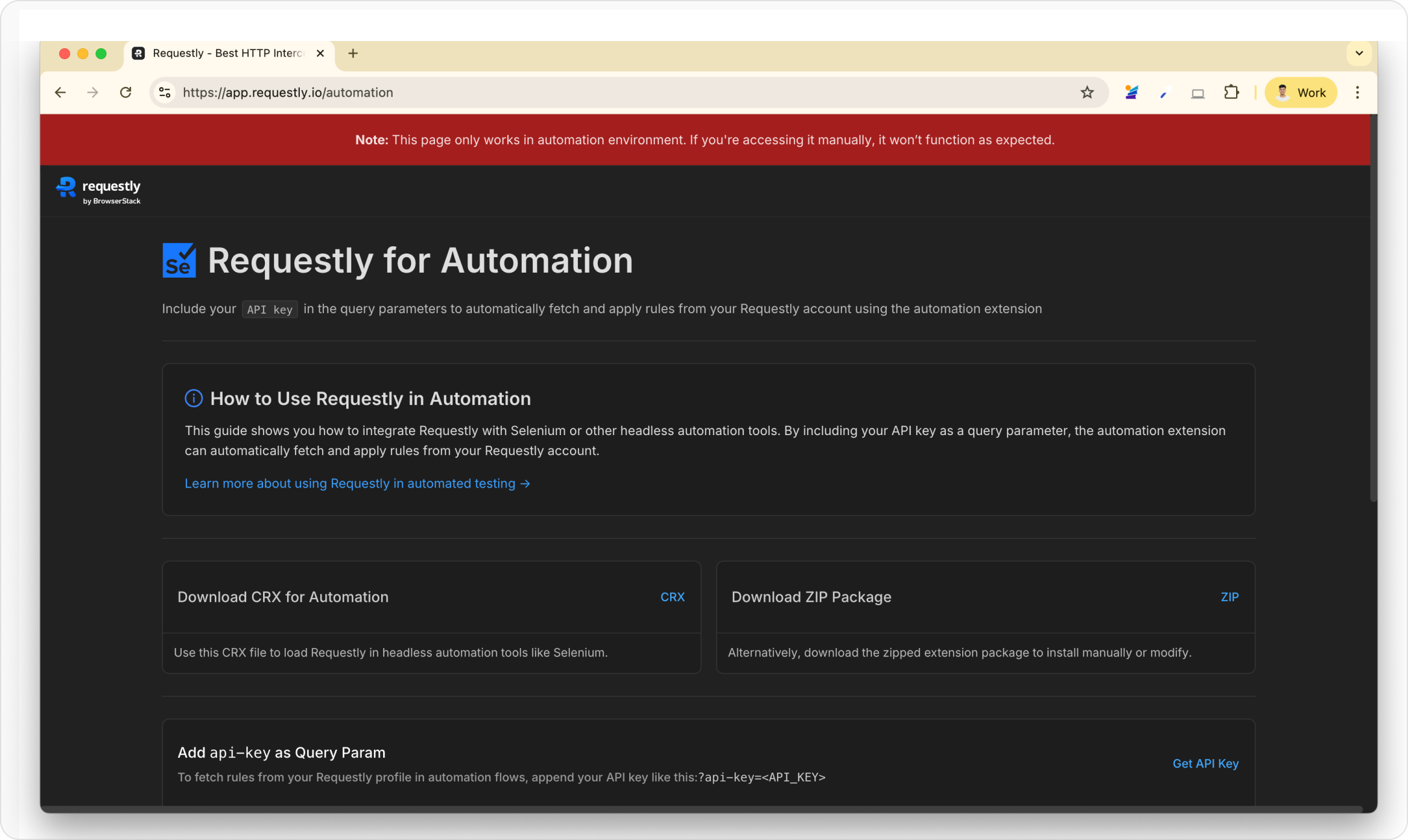 There are 2 main ways to use Requestly in an automation environment:We also offer an NPM package, @requestly/rq-automation, to make this easier.