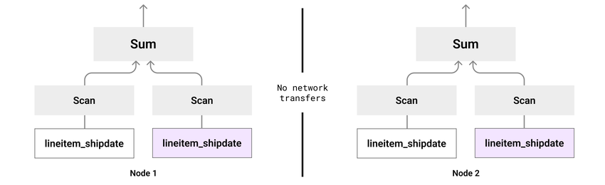 SELECT COUNT(l_orderkey), o_orderdate, l_shipdateFROM lineitem INNER JOIN orders WITH (use_projection='orders_shard_orderkey_sort_orderdate') ON lineitem.l_orderkey = orders.o_orderkeyWHERE l_shipdate BETWEEN '1992-01-01' AND '1992-01-31'GROUP BY l_shipdate, o_orderdate;