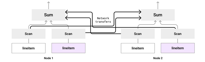 need to be transferred between nodes so that all rows from lineitem
