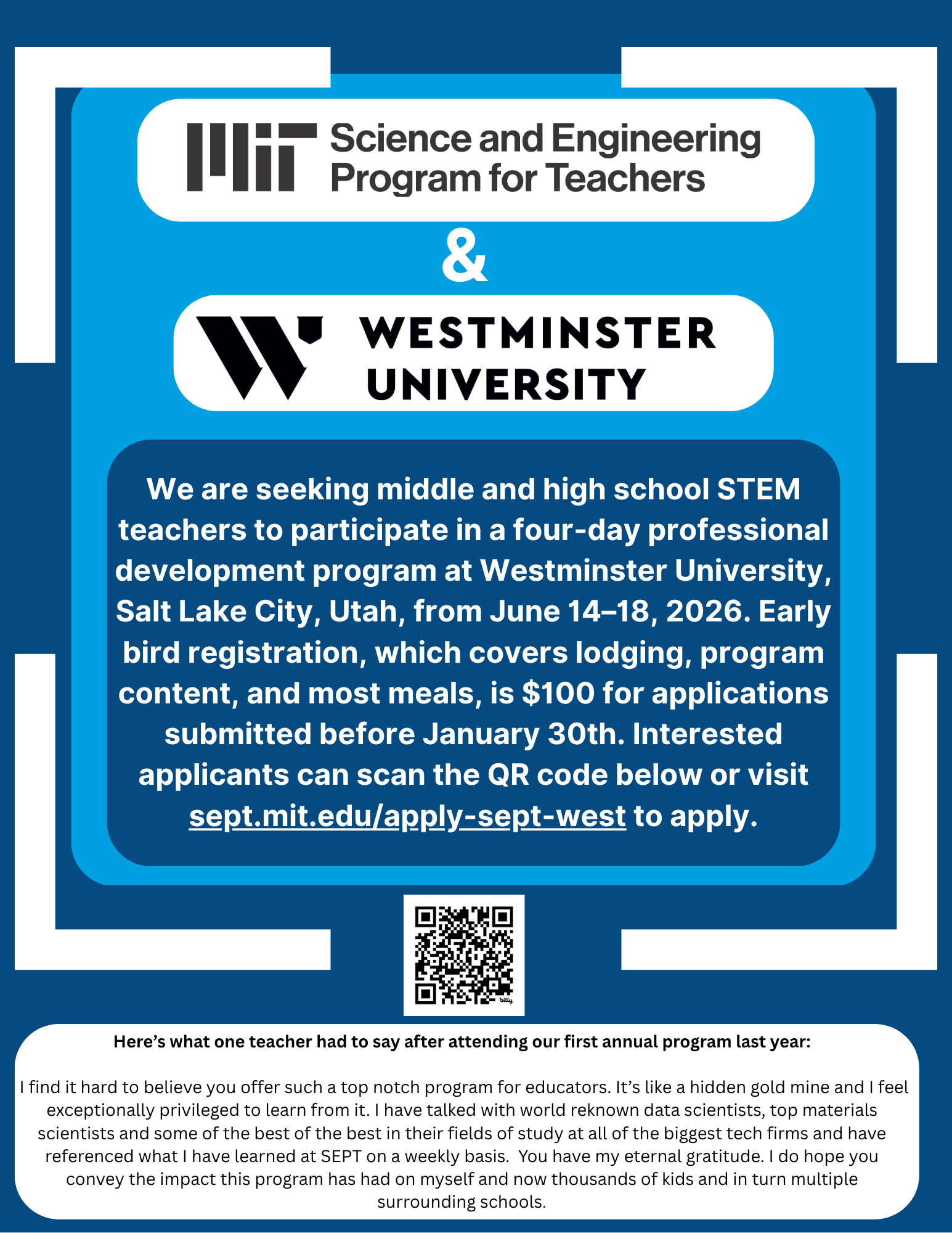 We’re excited to announce that applications are now open for the second annual Science and Engineering Program for Teachers (SEPT) at Westminster University in Salt Lake City, Utah. This June, we will welcome 30 middle and high school STEM teachers from across the Western United States for a four-and-a-half–day professional development program hosted on Westminster University’s campus.
