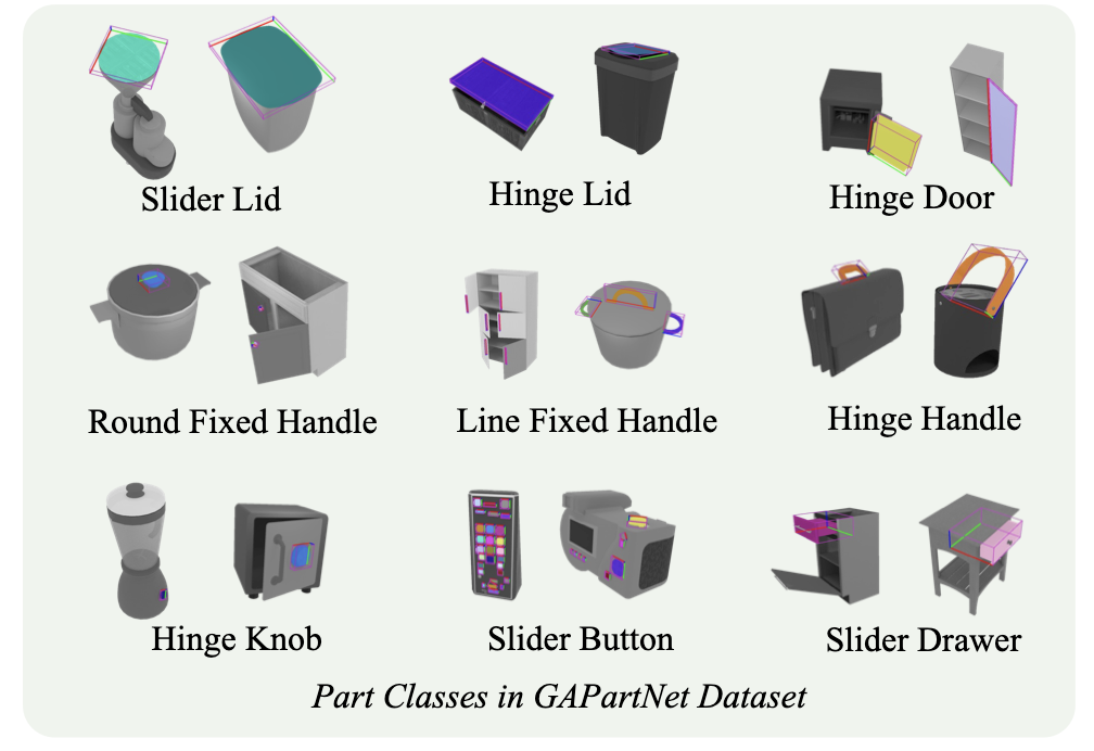 | GAPartNet: Learning Generalizable and Actionable Parts for Cross-Category Object Perception and Manipulation |