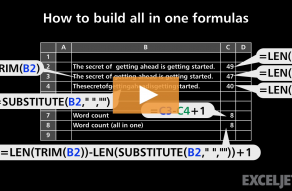 LEN(TRIM(A1))-LEN(SUBSTITUTE(A1," ",""))+1 Because this formula depends on single spaces to get an accurate word count, TRIM is used to normalize space before the count is calculated. Full description here.