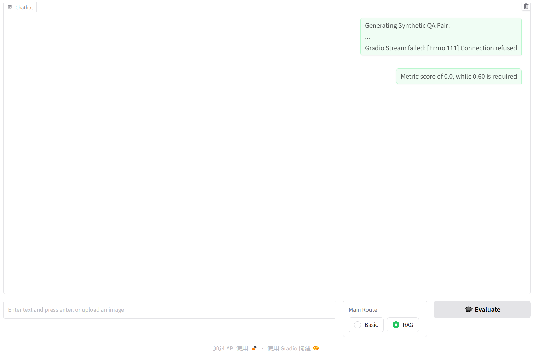 When I completed Notebook8, ran the code to open the front-end web interface, clicked on “Evaluate” in the bottom right corner, and the result displayed was: Generating Synthetic QA Pair: Gradio Stream failed: [Errno 111] Connection refused