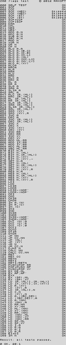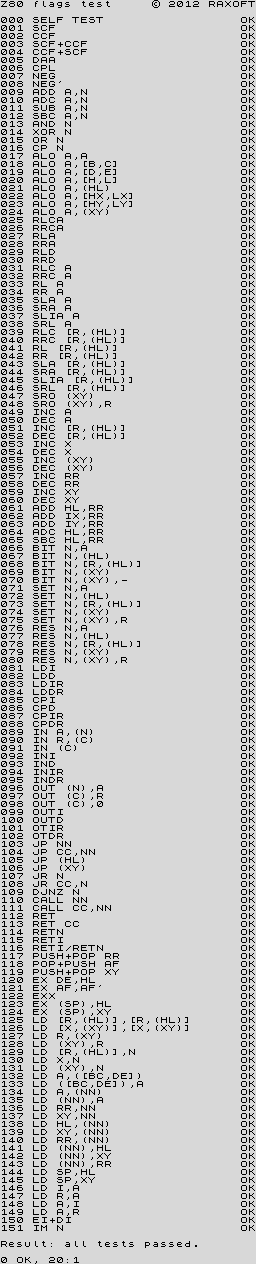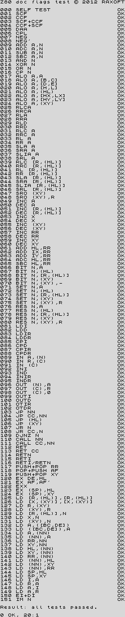 This suite performs a series of tests to verify the MEMPTR documents (English, Russian), which are spot on, as well as a brief run through several of the CBh/DDh/FDh opcode ranges. The test results in the program are compared against those from a NEC D780C-1 CPU, but Simon Conway kindly tested several other Z80 clones, confirming the same results.